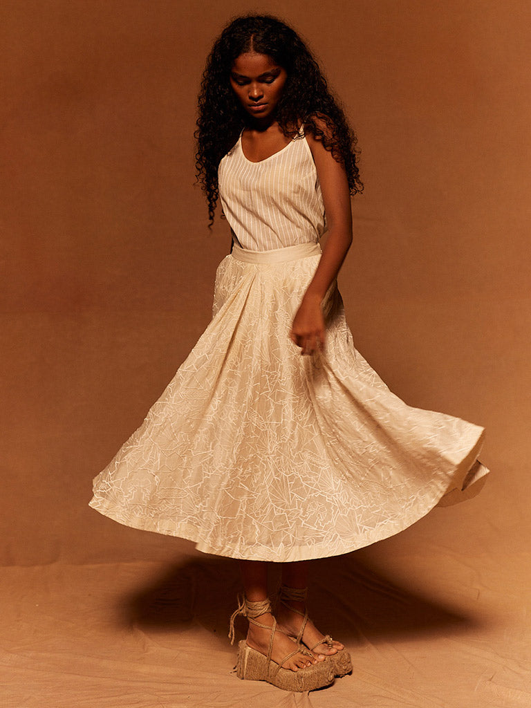 The Muryo Embroidered Skirt features a beautifully detailed full embroidery on luxurious Chanderi fabric, with a flowing circular cut and an elasticated back waistband for a relaxed fit. This effortlessly chic skirt pairs seamlessly with any blouse, making it a versatile and feminine staple in your wardrobe. Inspired by the essence of freedom, its fluid silhouette embodies both comfort and elegance, perfect for everyday wear.