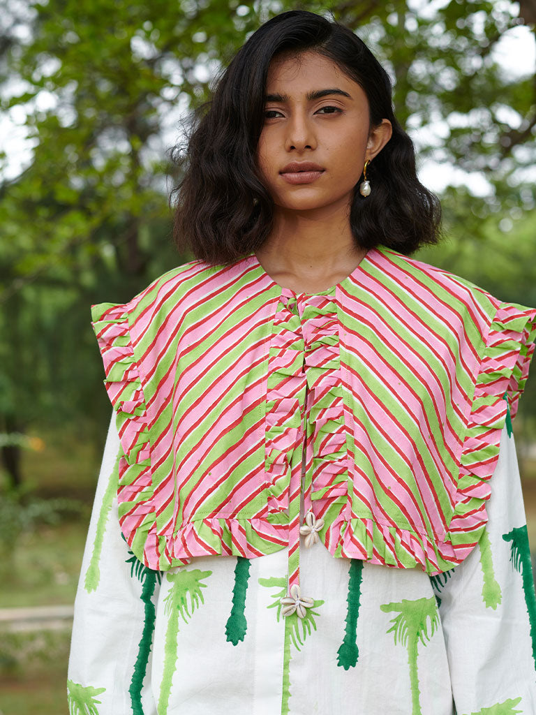 Relaxed fit shirt in our Khajoor Vol.1 print with dual shaded palm trees, featuring a dramatic puritan frill collar in stripes. Tie detail on the neck with shells. Paired with comfortable lollipop stripes trousers with a front opening and pockets. A perfect resort look for your next vacation.