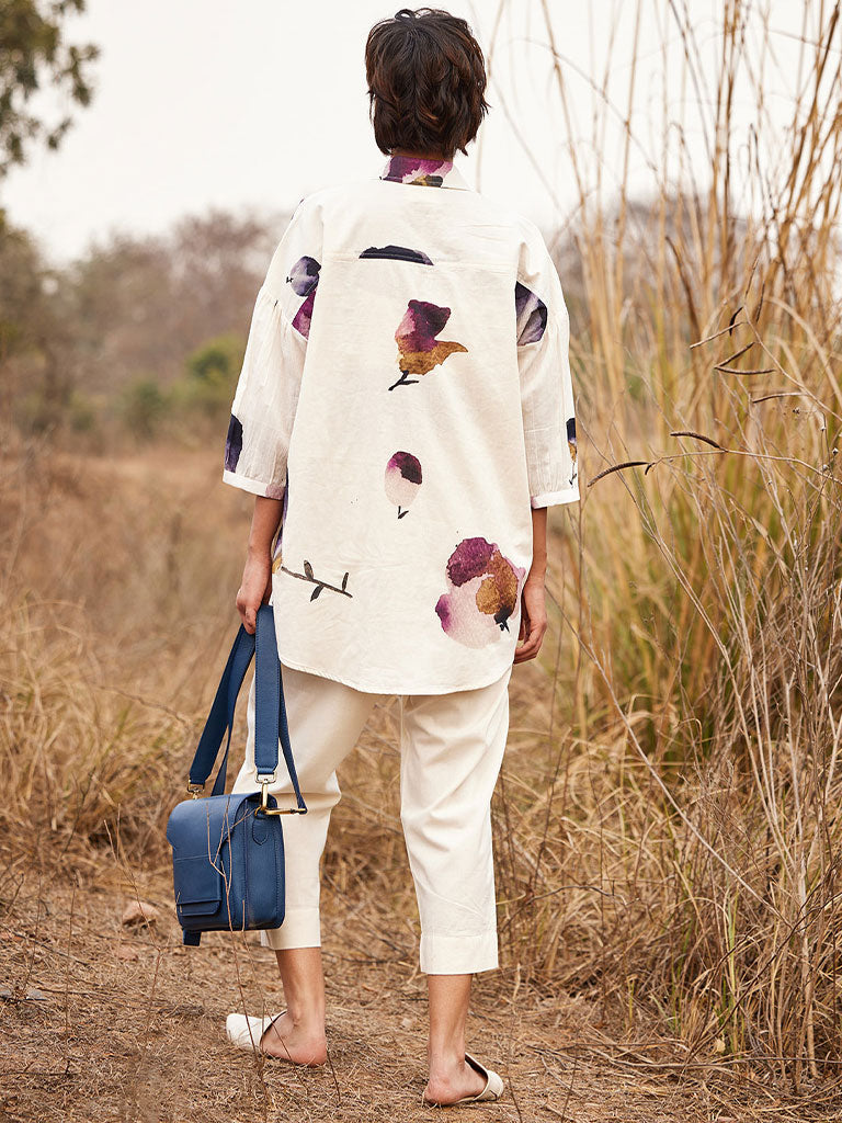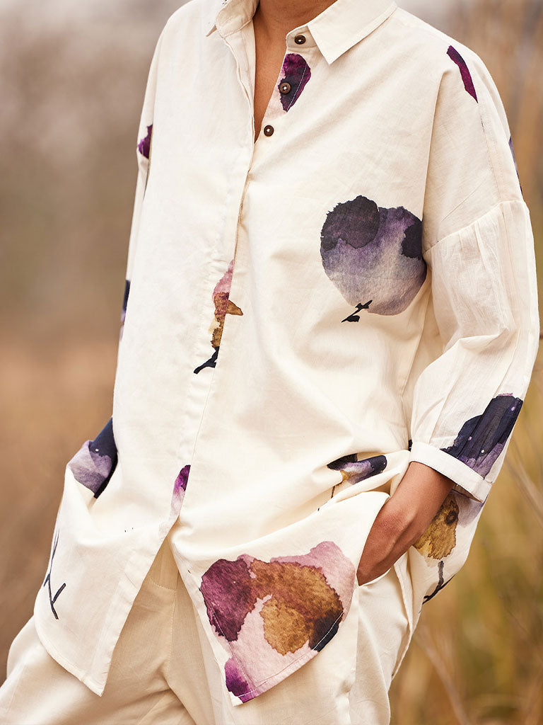 A vibrant floral printed co-ord set featuring a shirt crafted in breathable cotton mul fabric, comes with pencil bottoms. This set features two convenient side pockets, combining utility and style.