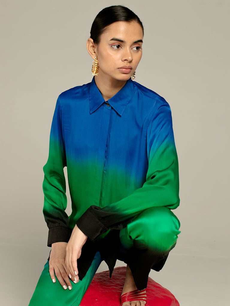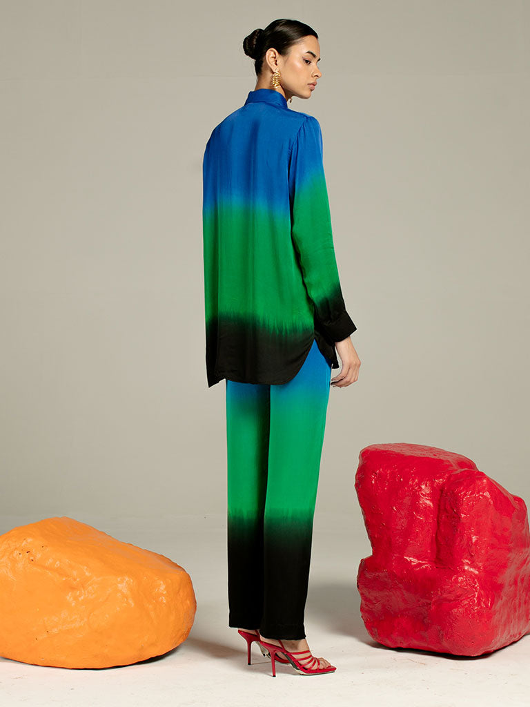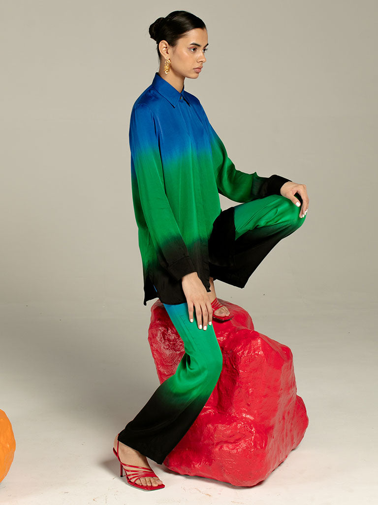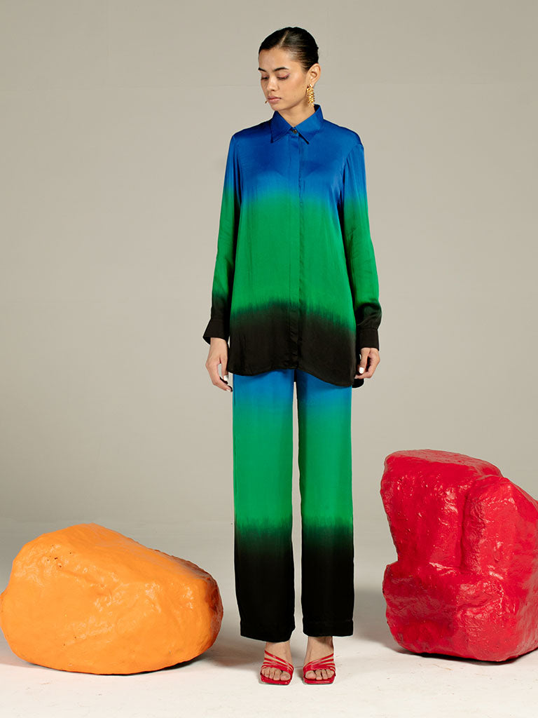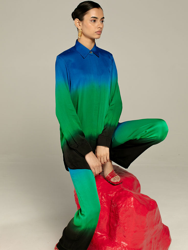 The Leheriya Shirt and Trouser Co-ord is crafted from our stunning vegan silk fabrication. This trans seasonal piece is a statement. Made in three elegant colors in an ombré design, this set is a trend setting piece. With a straight shirt and casual fit straight trousers that have a front opening and pockets, the set has an interplay of colors. You can pair it with heels for an elegant look.