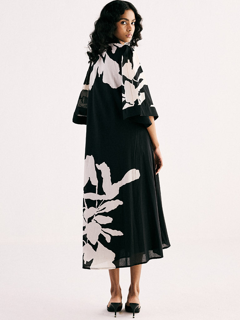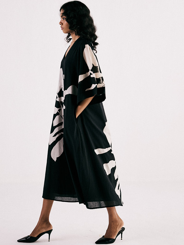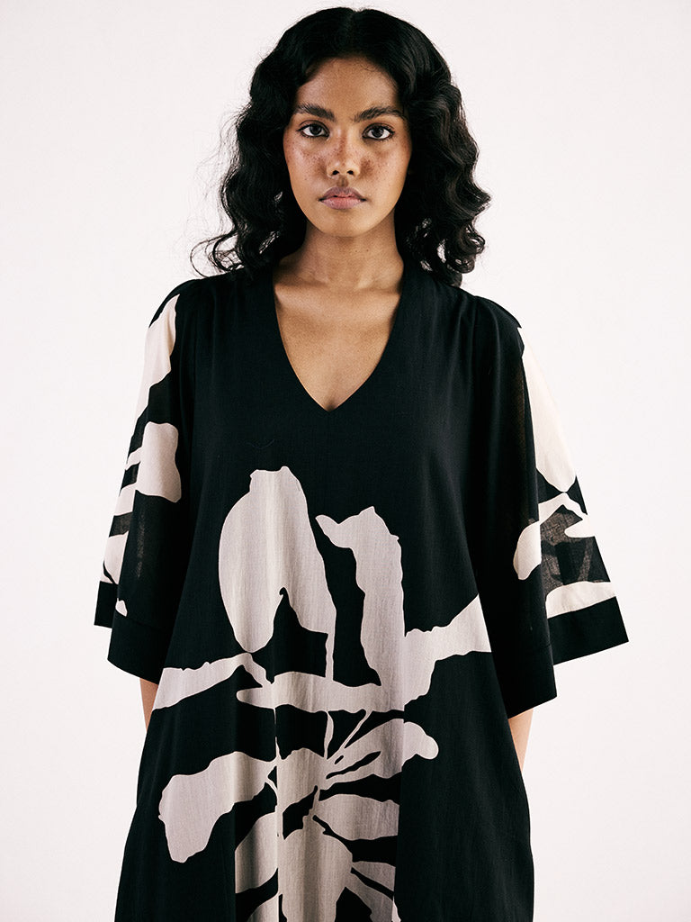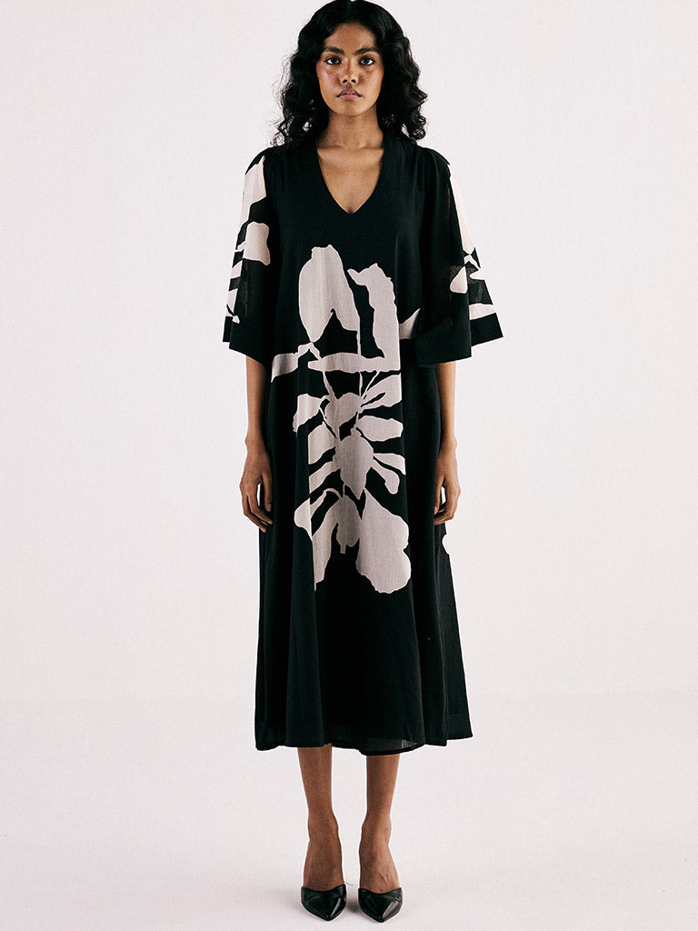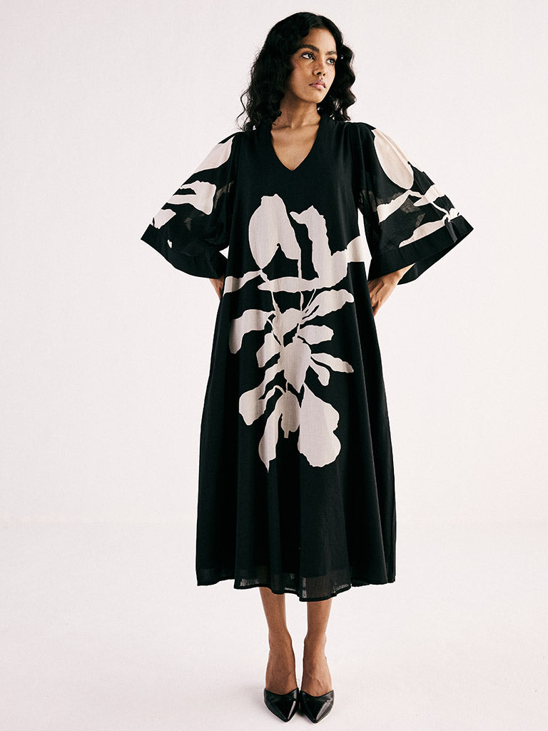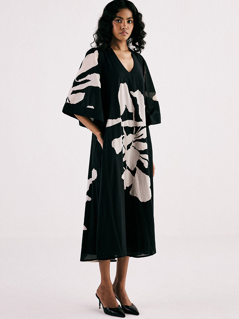 A classic monochromatic A line midi dress featuring a v neckline and bell sleeves crafted from breathable soft cotton mul fabric and adorned with a statement print. The dress is fully lined and comes with side seam pockets.