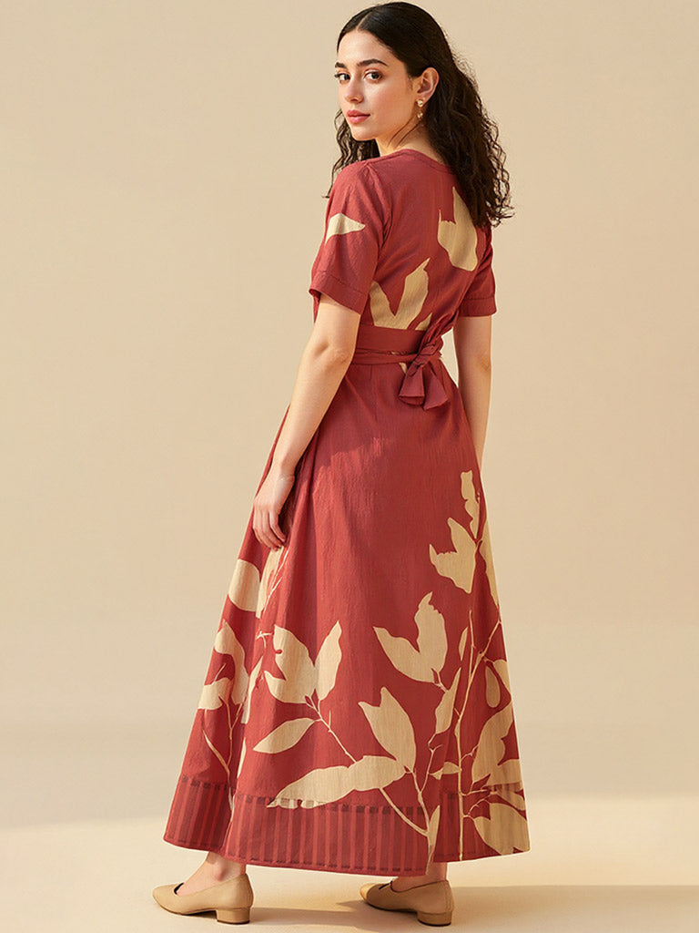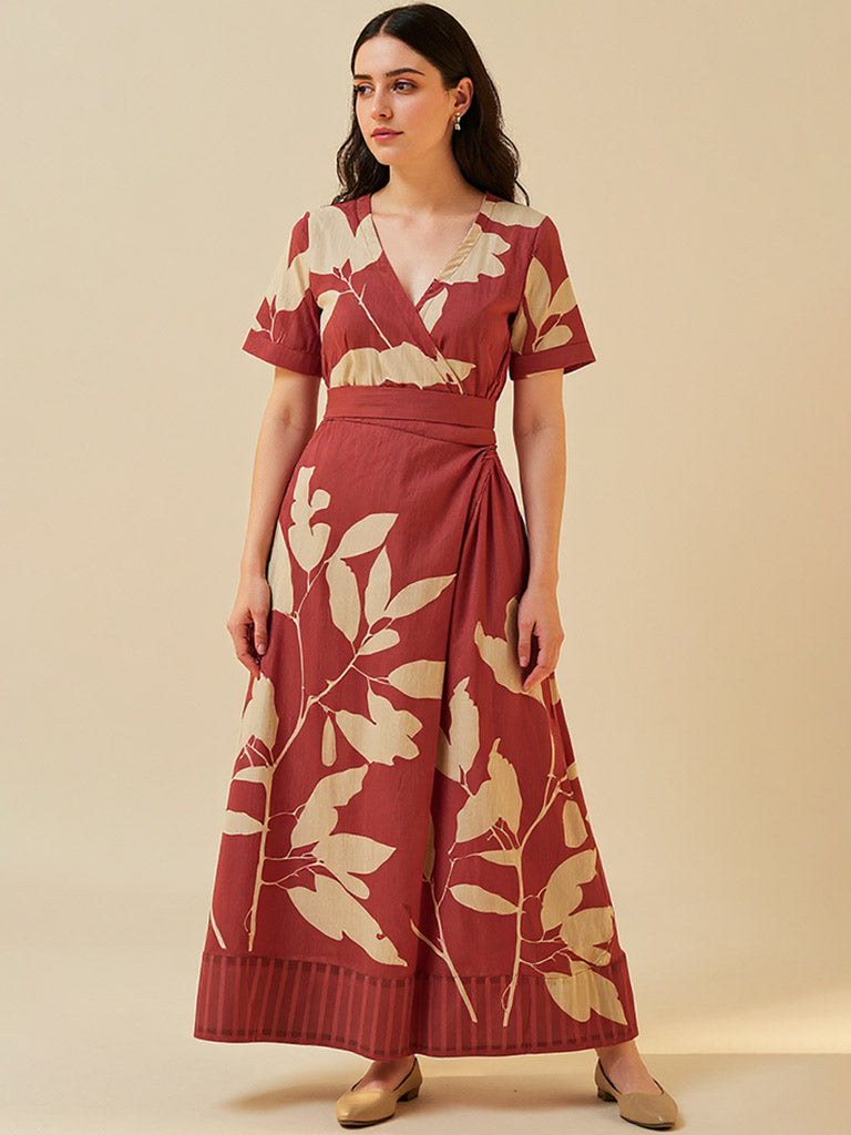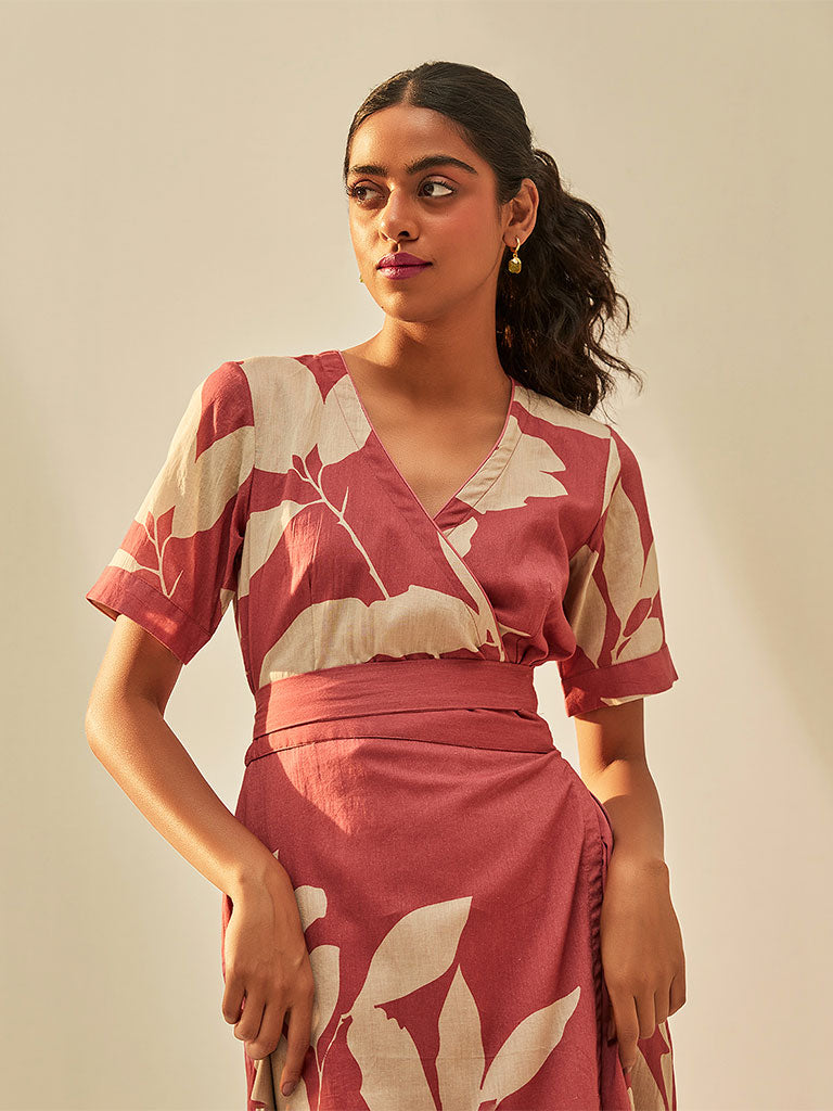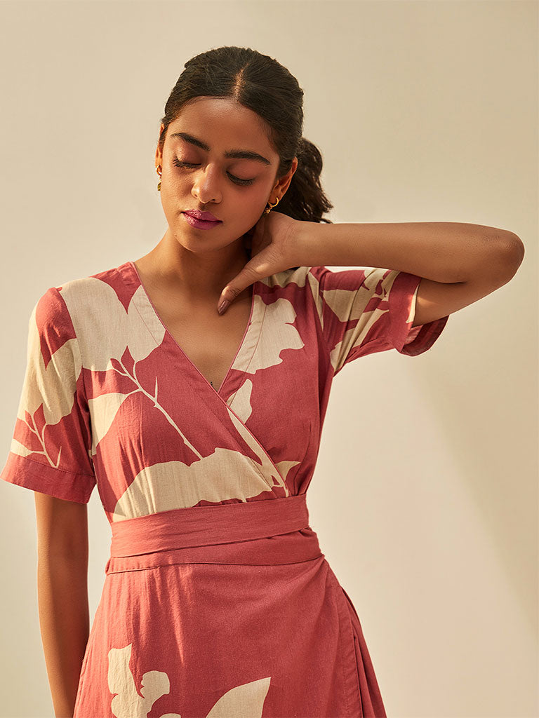 A study in grace and elegance, This wrap dress brings with it a feminine charm. Crafted in soft cotton mul, this dress comes with side seam pockets and is fully lined.