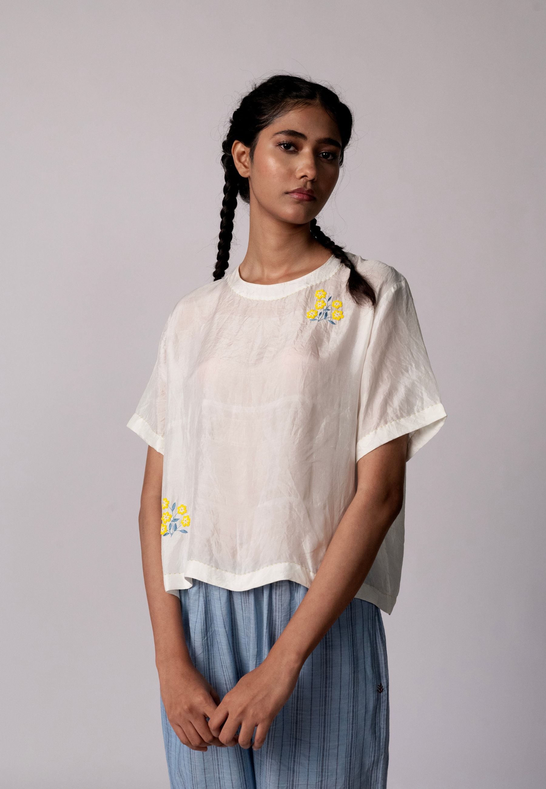 Indulge in our Tara T-Shirt, crafted from Murshidabad Mulberry silk for a luxurious feel. Featuring little knotted secrets and a seafoam green color, this 2 ply shirt offers something new to discover every time you wear it. Elevate your wardrobe with this timeless and sophisticated piece in Silk White.