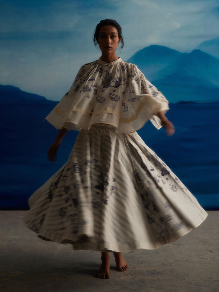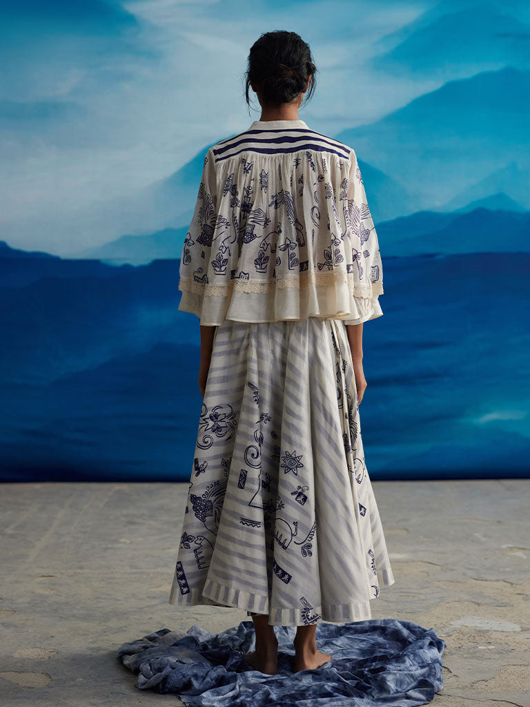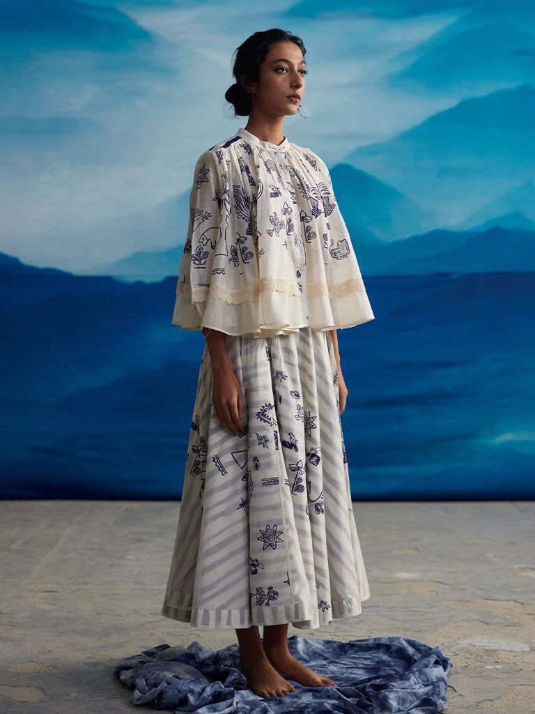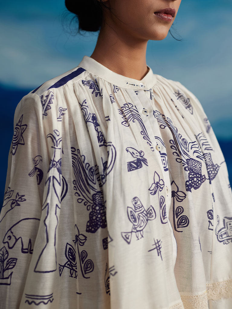 Crafted from premium chanderi fabric, this elegant shirt features hand-screen printed details and delicate lace accents. The gathers cascading down the shoulder add a touch of sophistication, while the band collar and the Mother of Pearl buttons complete the exclusive look.