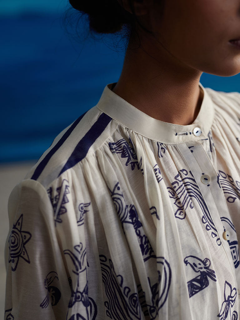 Featuring soft pleats gracefully descending the shoulders, our feminine and playful gathered shirt is a versatile piece that seamlessly moves from casual street strolls to office chic. With a laid-back yet refined aura, this blouse is a timeless beauty to cherish. The dreamy design is enhanced with intricate lace accents and hand-screen printed motifs, injecting a daily dose of allure and sophistication. Combining comfort and style, this shirt is a charming choice for those who appreciate a touch of everyday glamour, whether wowing the office or wandering through the streets.