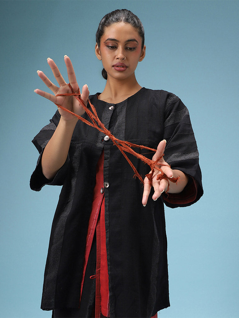 The Dual Essence Jacket is a fusion of modern minimalism and timeless elegance, featuring a relaxed, oversized silhouette in deep black with subtle tonal stripes. Designed with a front button closure and hidden red lining, it offers versatility and effortless layering. Functional pockets and breathable fabric enhance comfort, making it a refined yet edgy wardrobe essential.