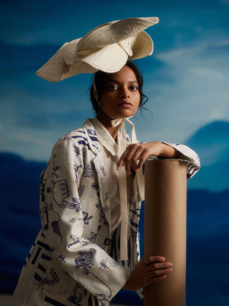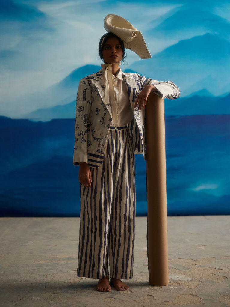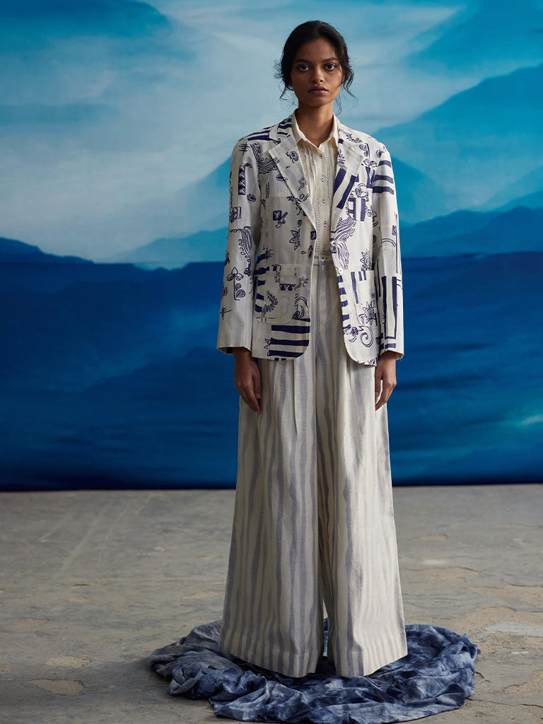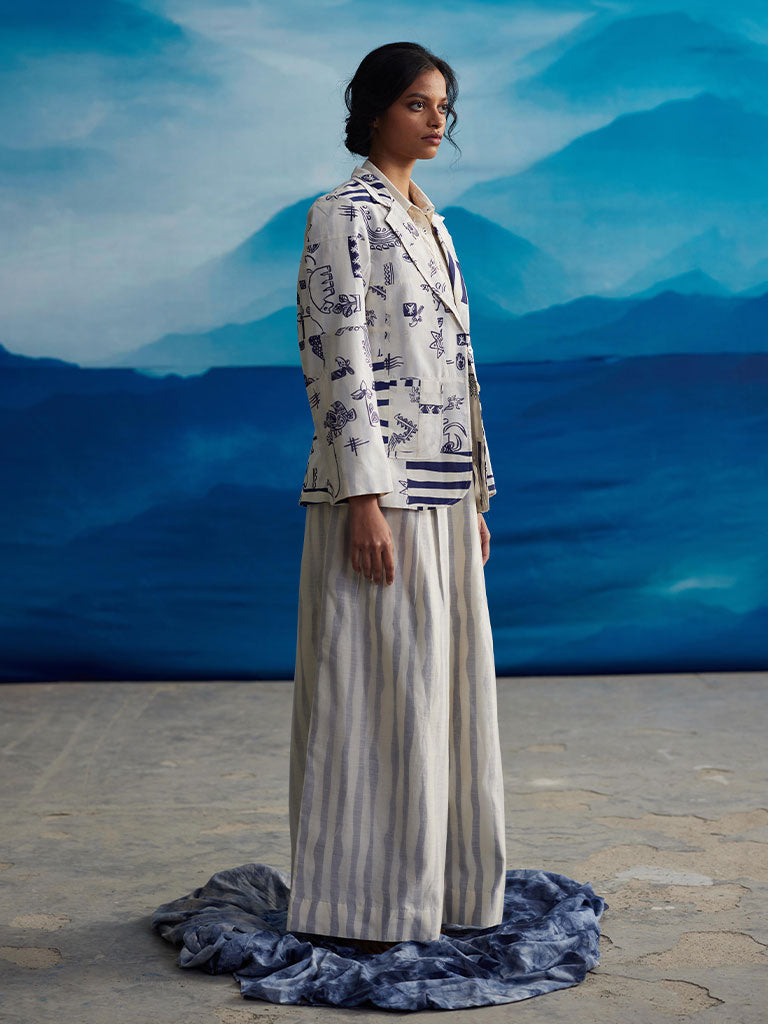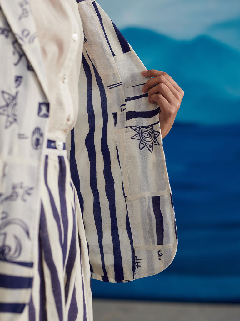 Crafted from luxurious Chanderi fabric and lined with hand-screen printed cotton, this ivory jacket features full sleeves, patch pockets, and mother-of-pearl buttons. Its timeless design and artisanal details make it a must-have for any discerning fashion connoisseur.