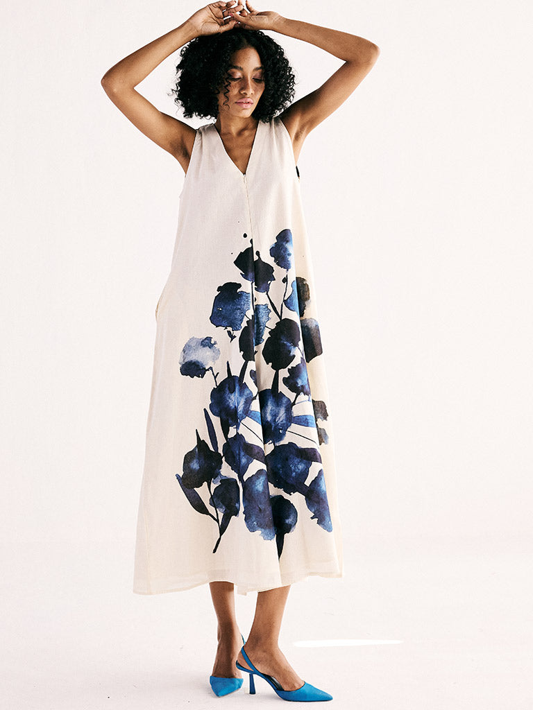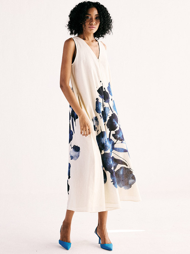 An ink blue floral printed jumpsuit with a front zipper opening and v neckline in classic A line silhouette. Crafted in soft breathable cotton mul. It is fully lined and comes with side seam pockets.