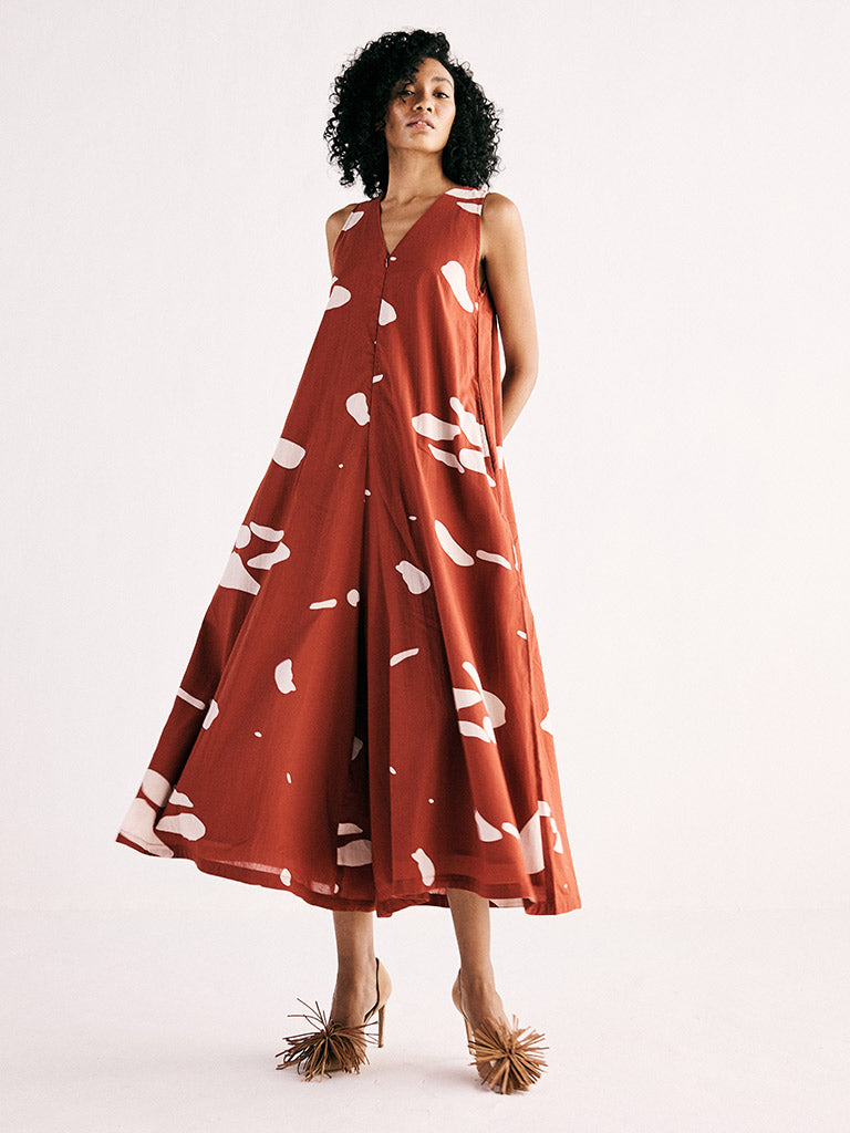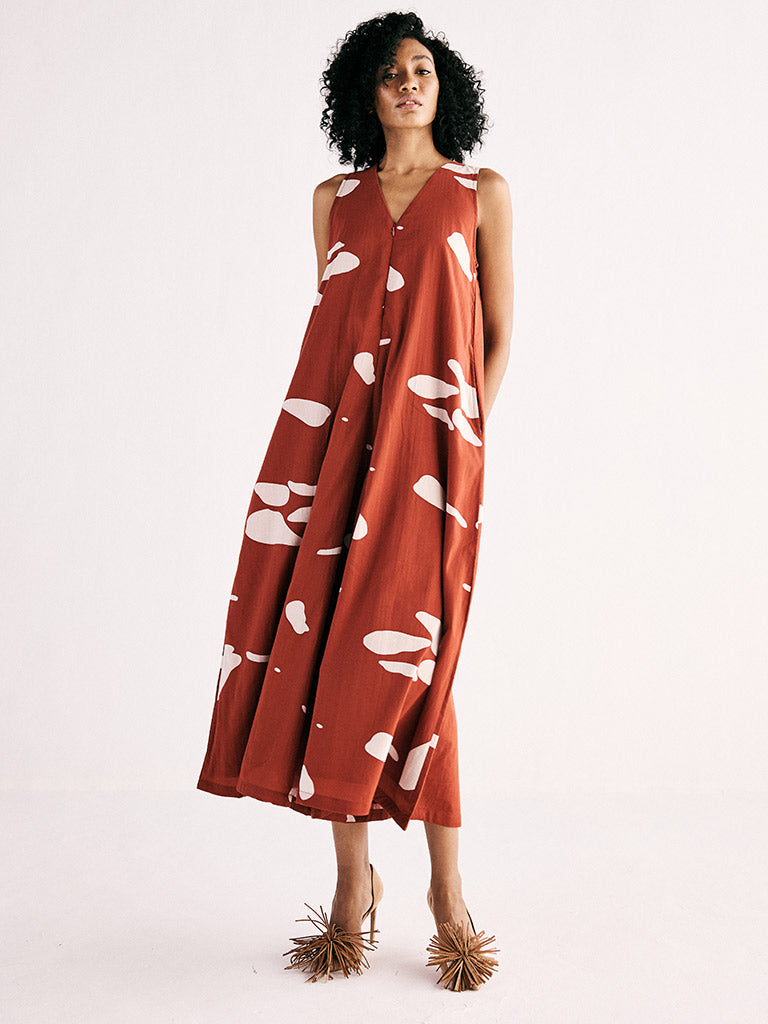 A brick red printed jumpsuit with a front zipper opening and v neckline in classic A line silhouette. crafted in soft breathable cotton mul. It is fully lined and comes with side seam pockets.