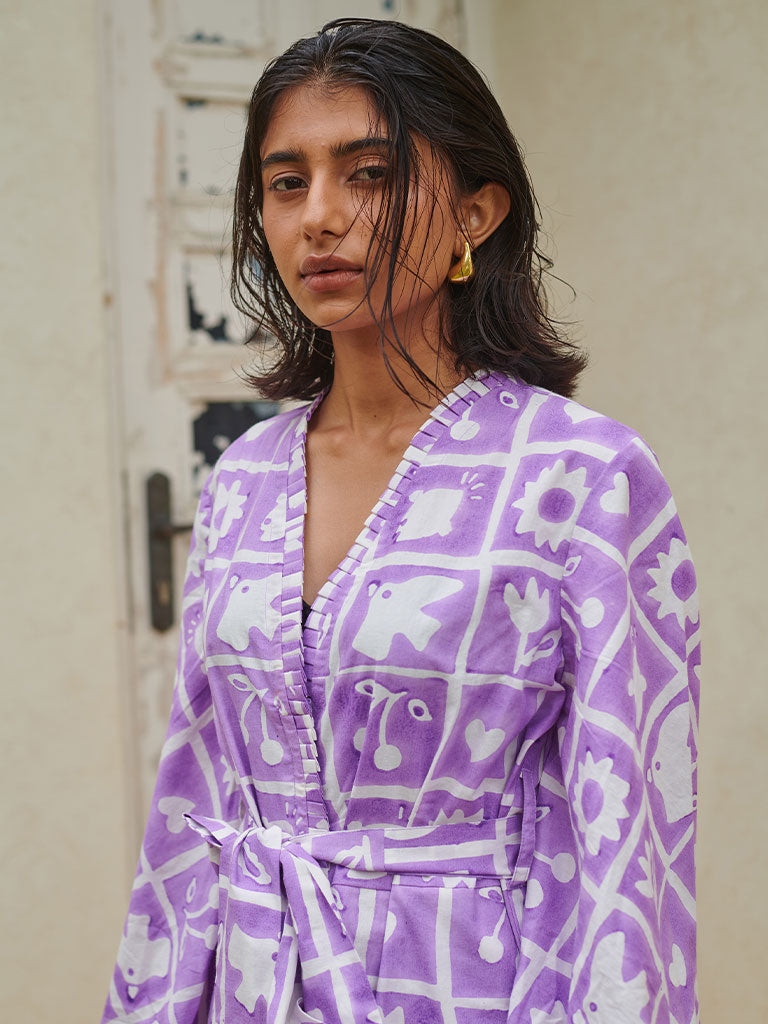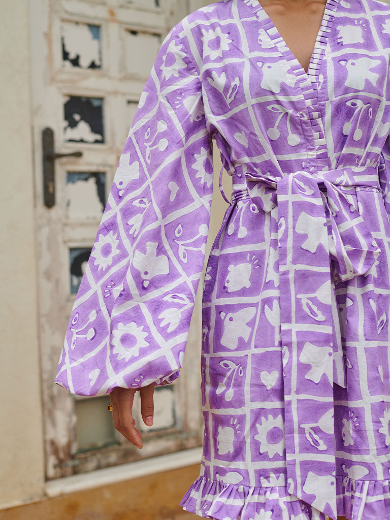 Knee length Jumpsuit in Hakuna Matata print in lavender, with stamp style flora and fauna illustration. Featuring pleats on V neck, bishop style sleeves and a waist tie for fitting. This chic piece is not to be missed!