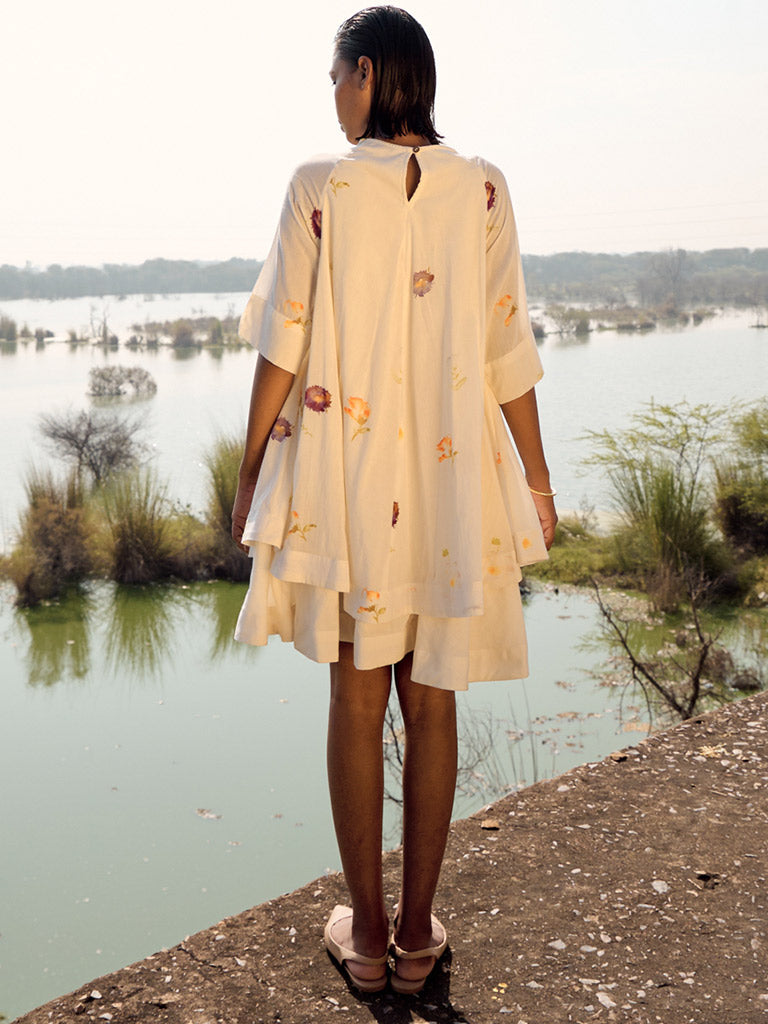 Luxuriate in the sophisticated elegance of this Starling Dress. Crafted from an off white floral print, this mul dress features a double layer at the hem, raglan sleeve, half sleeves and a back button opening. Exclusively designed with a one-of-a-kind water colour print, this dress is fully lined and sure to make a statement.