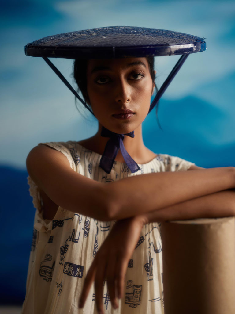 The elegant ivory color and Chanderi fabric exude sophistication. The pleated detail with blue top stitch and lace details on the armhole create a timeless and exclusive look. Hand-screen printing and a side tie up add a touch of artistry to this dress. It comes with a cotton slip dress that's adorned with lace work.