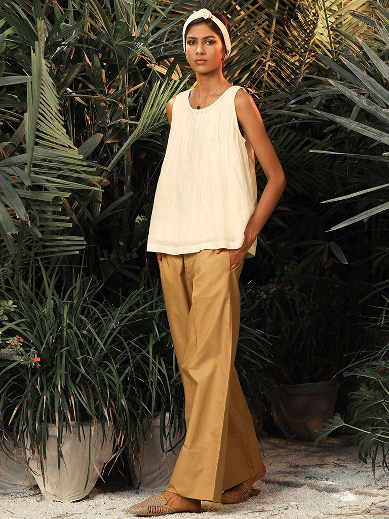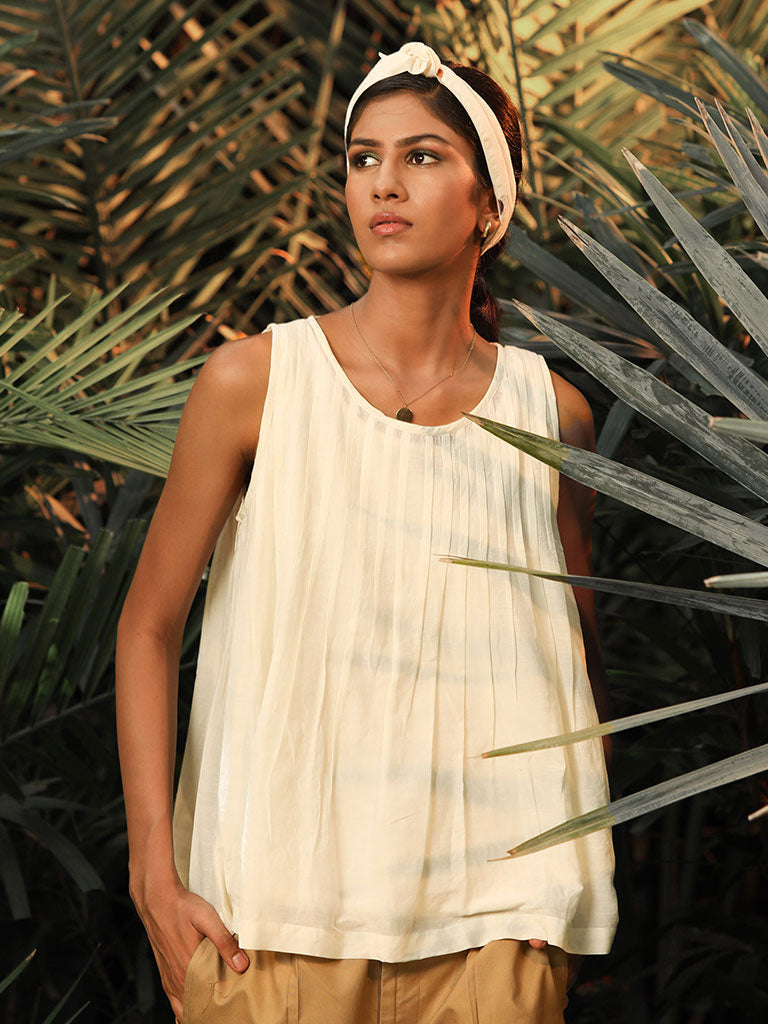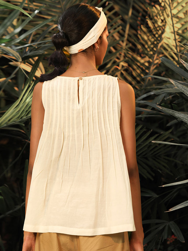 A plain white sleeveless mul top with pleats in the front and back, attached lining and a keyhole back opening.