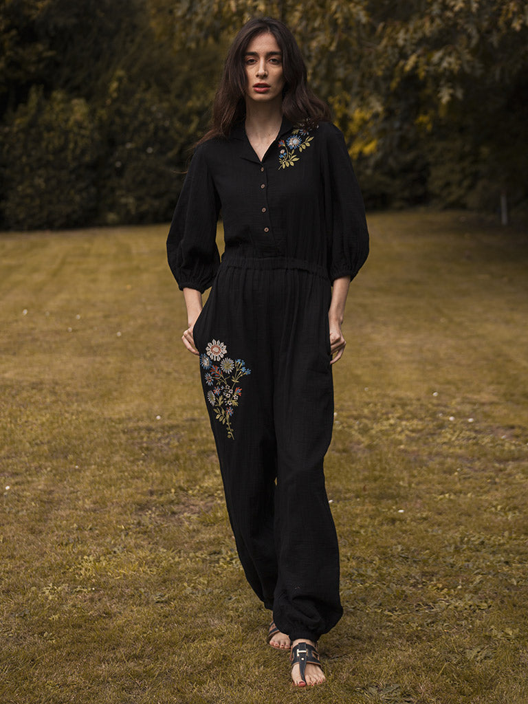 Step into quintessential style with our black jumpsuit, a piece that offers the utmost comfort and a luxurious feel with its double-layered cotton. This jumpsuit is designed to make you feel fabulous and cozy any day. The intricate embroidery, perfectly placed on the silhouette, adds an exquisite touch of wabi-sabi, where imperfection meets beauty. It's a truly easy-going piece, allowing you to enjoy the entire day in comfort and style.
