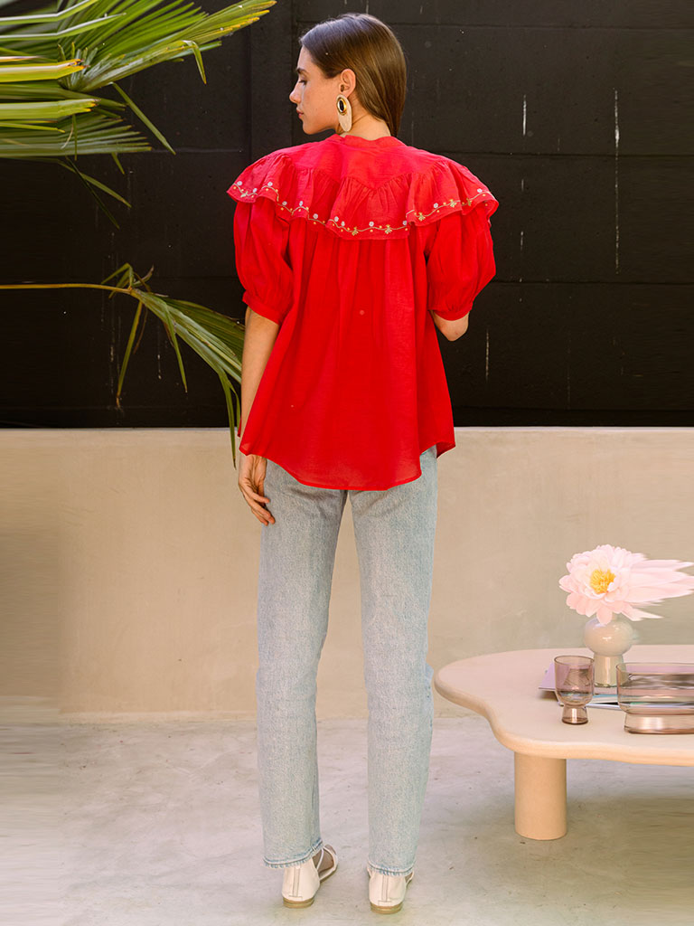 Ignite your passion with Em & Shi's Red Cottage Shirt. Adorned with delicate embroidery in soft colors, this piece is truly a keeper. Designed to last, it will become a timeless staple in your wardrobe, adding a touch of elegance whenever you wear it. Easy to pair with denim or beige bottoms, this beading and embroidery collared top exudes effortless charm. Experience the allure of timeless style with our Red Hot Vintage Style Shirt.