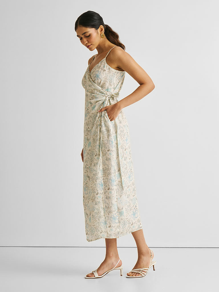 A strappy, feminine dress that will look amazing at festive dinners and special occasions.This Strappy Blue Floral Wrap Dress is an elegant piece that can be dressed up or down. Crafted from luxurious Bemberg™ Crepe, it features a regular fit and detailed belt for a cinched waist. Adjustable straps and a subtle floral pattern add a stylish touch.