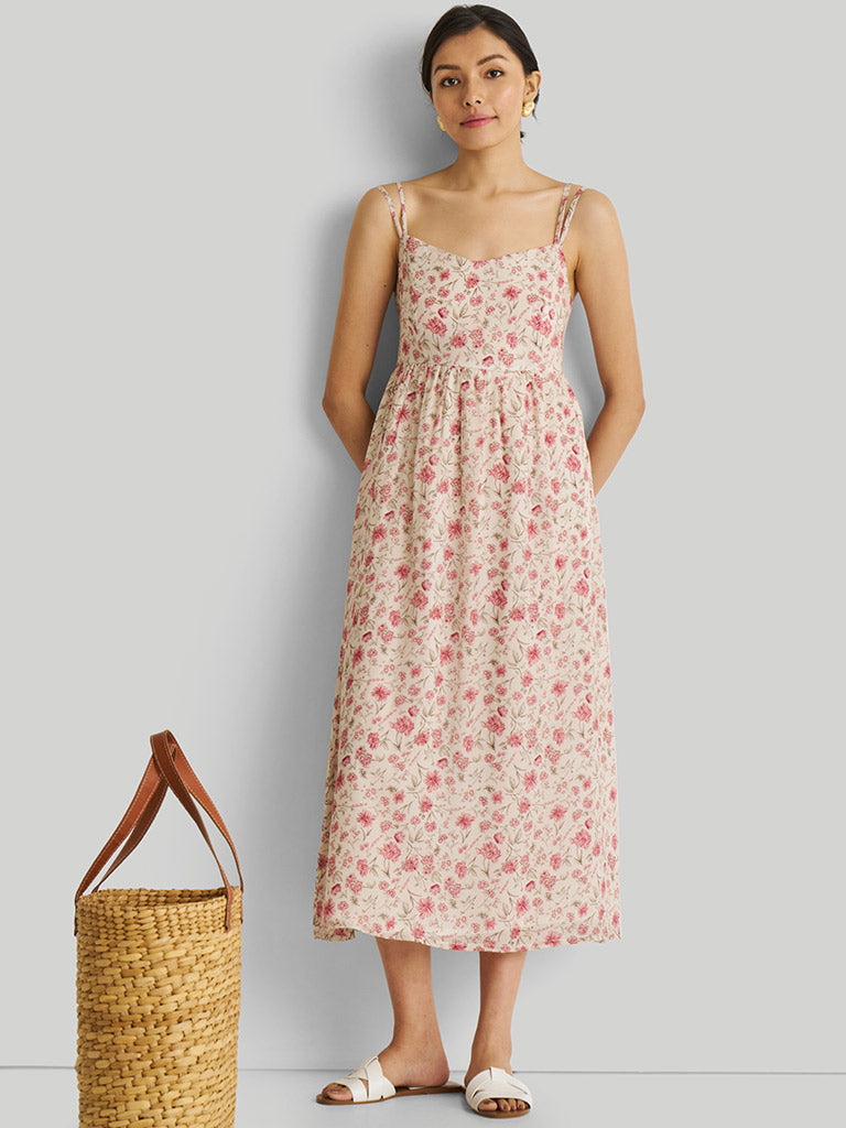 Fall in love with nature’s tapestry with this floral, bemberg crepe maxi dress that features a feminine double strap and gathers at the waist.