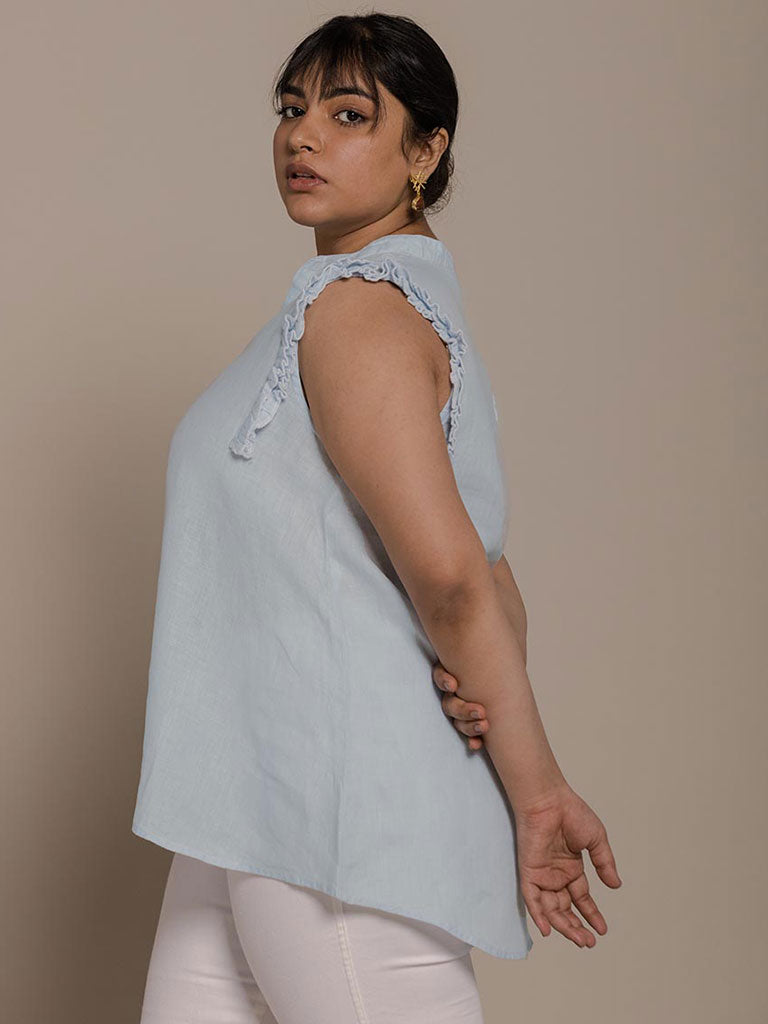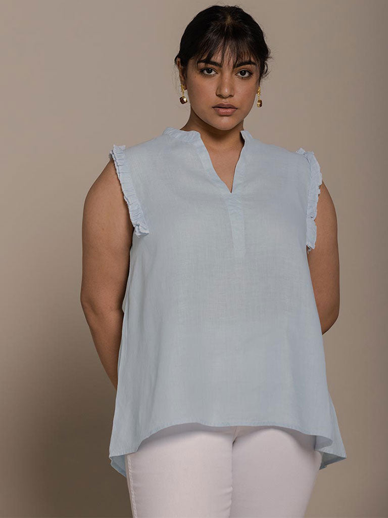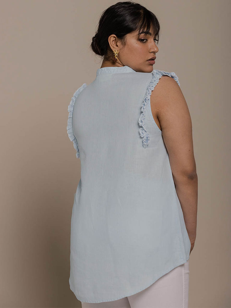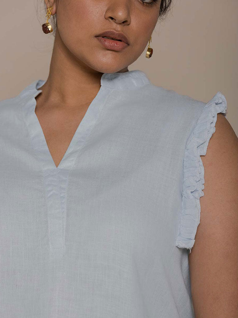 With its stylish Mandarin V-neck collar, this versatile ruffle sleeveless top has a flirty and flattering cut to suit all body types.