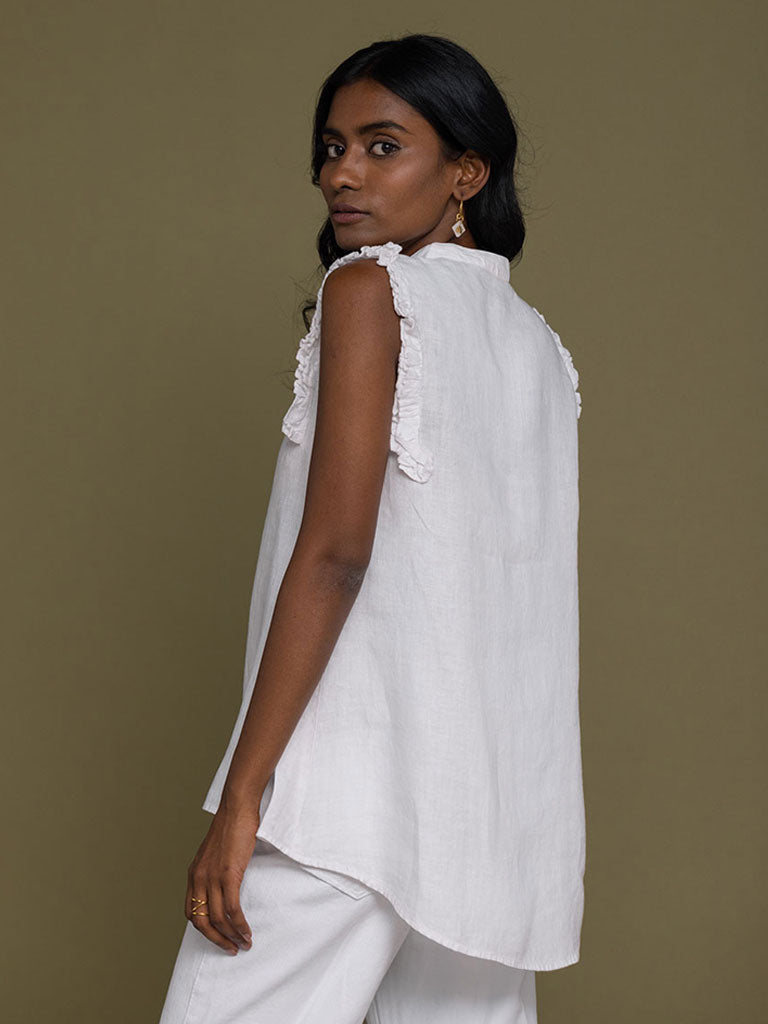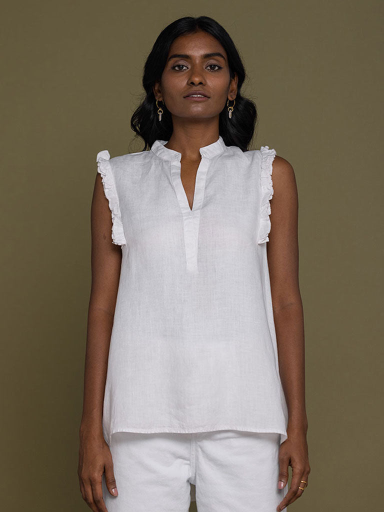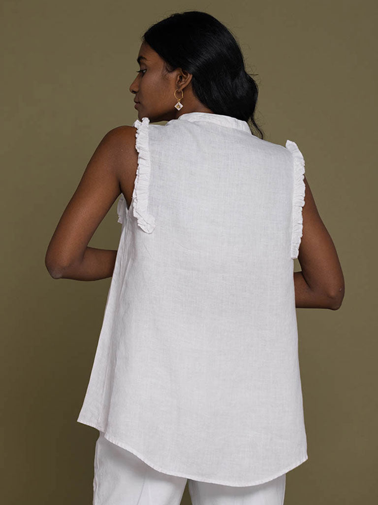 With its stylish Mandarin V-neck collar, this versatile ruffle sleeveless top has a flirty and flattering cut to suit all body types.