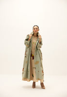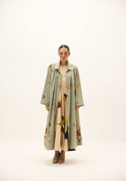 A statement full-length trench dress in sturdy canvas duck, adorned with soft painterly florals in muted tones. Designed with a classic collar, gathered shoulders, and a fluid, open-front silhouette, it layers effortlessly - balancing structure with feminine ease.