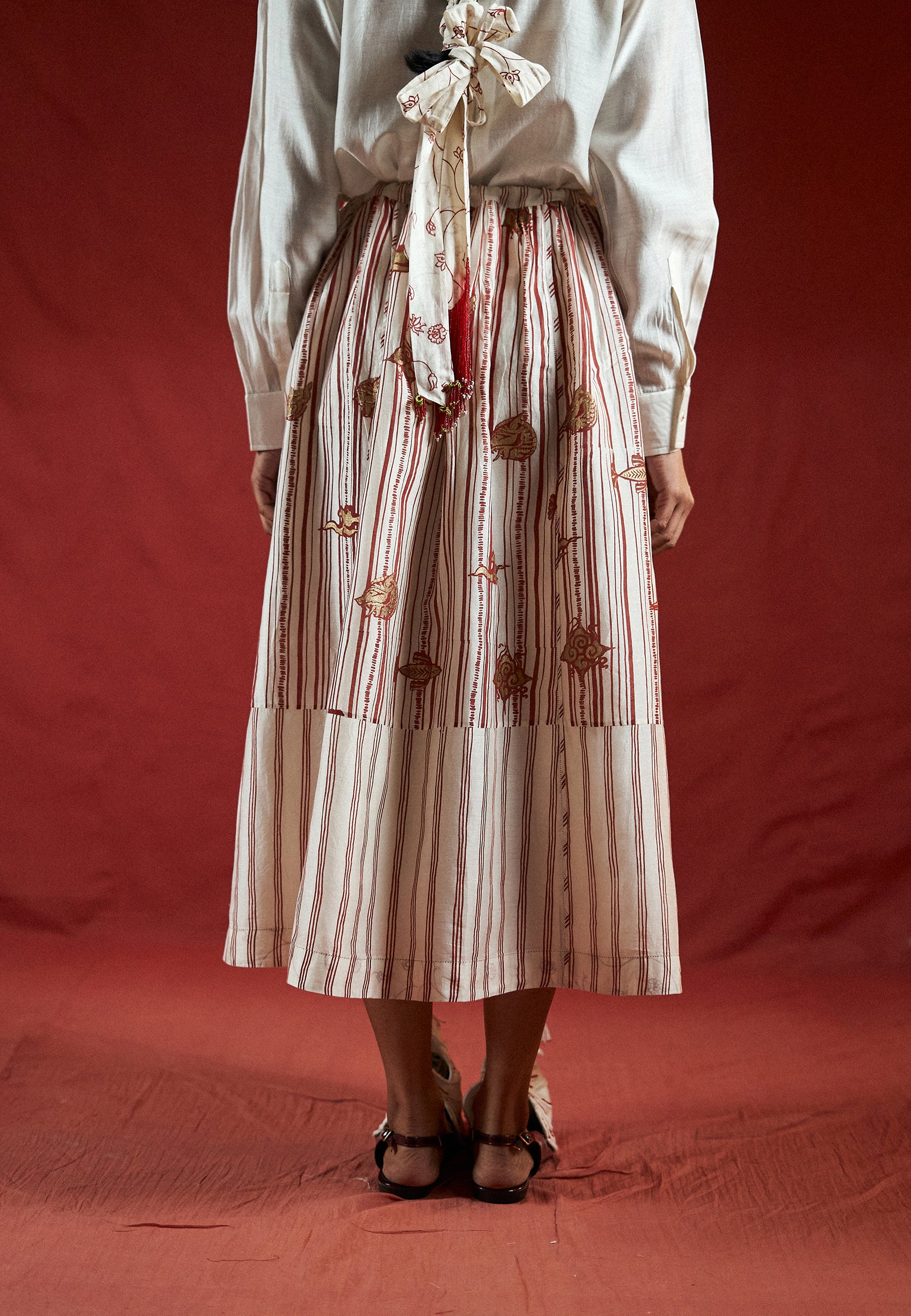 Crafted in cotton silk, the Htami Drawstring Skirt is a playful half-and-half garment featuring a drawstring waistband that ties at both ends for a perfect fit. Soft gathers create gentle movement, while handmade beaded tassels lend delicate detail. The skirt flows effortlessly, complementing every body type and occasion with ease. Hours of meticulous handwork and artisanal skill make this piece a charming blend of comfort, versatility, and elegance.