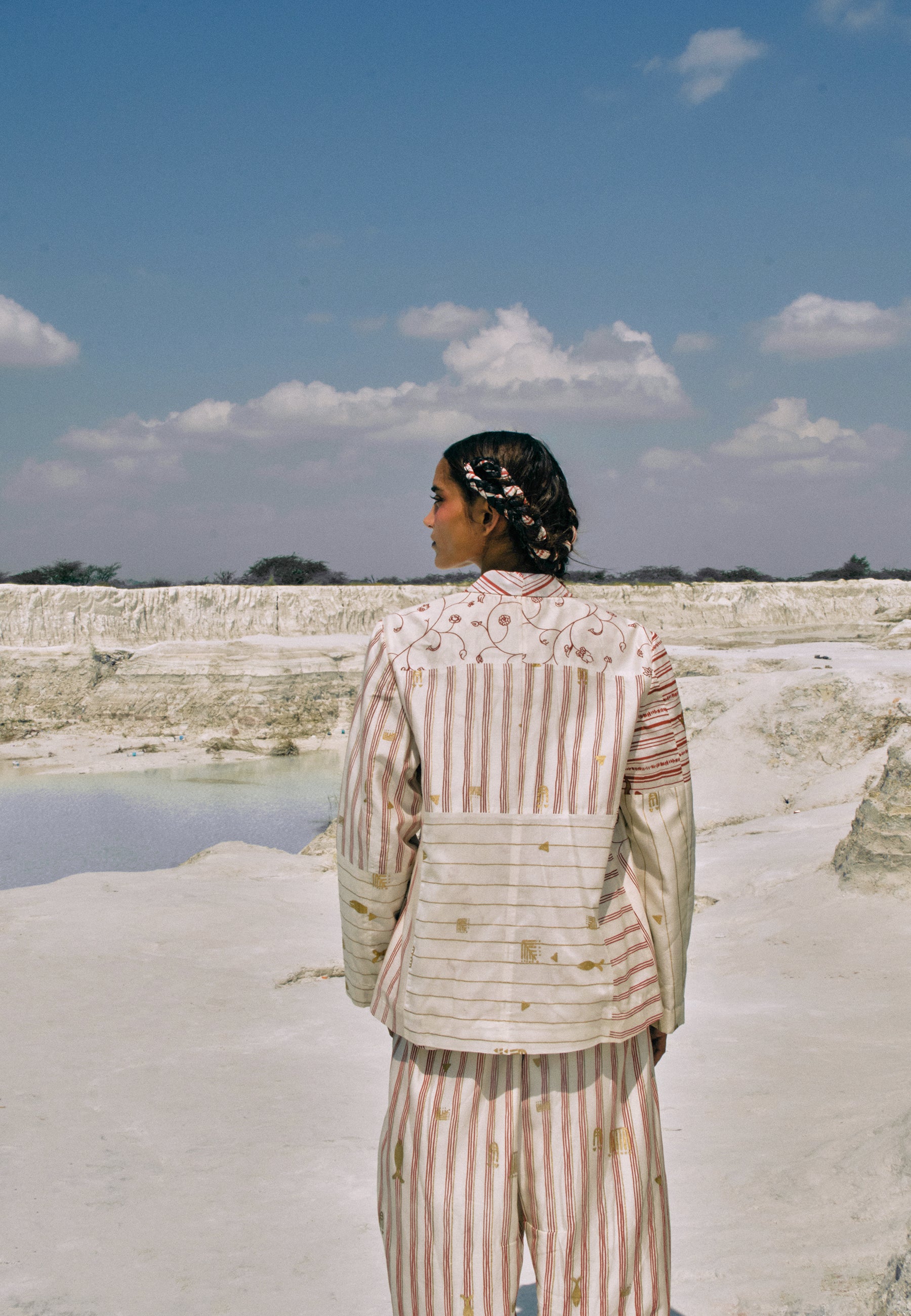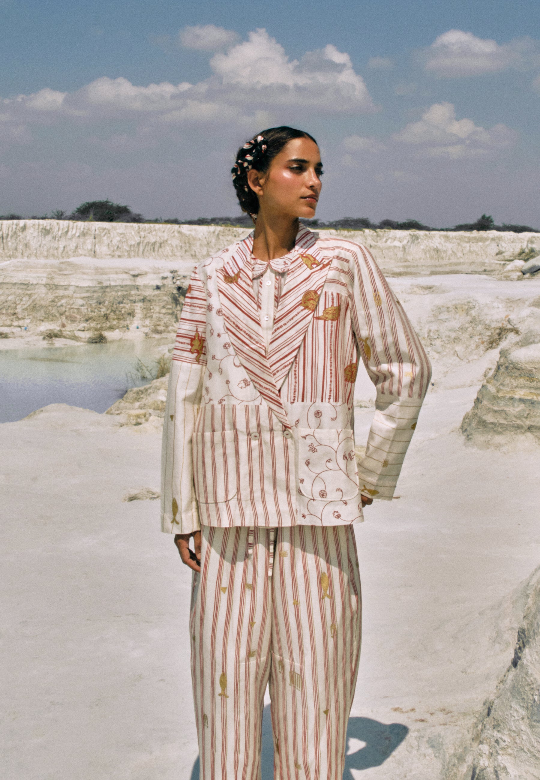 A true statement of craftsmanship, the Lumina Double-Breasted Blazer is a patchwork of the collection’s fabrics and prints. Each patch has been meticulously placed and stitched over hours of labour, reflecting the dedication and artistry of the artisans. Featuring a classic pointed lapel, structured silhouette, and functional pockets, it provides versatility from everyday wear to high tea. This blazer embodies refinement, artistry, and the careful integration of multiple textures and motifs into a single harmonious piece.