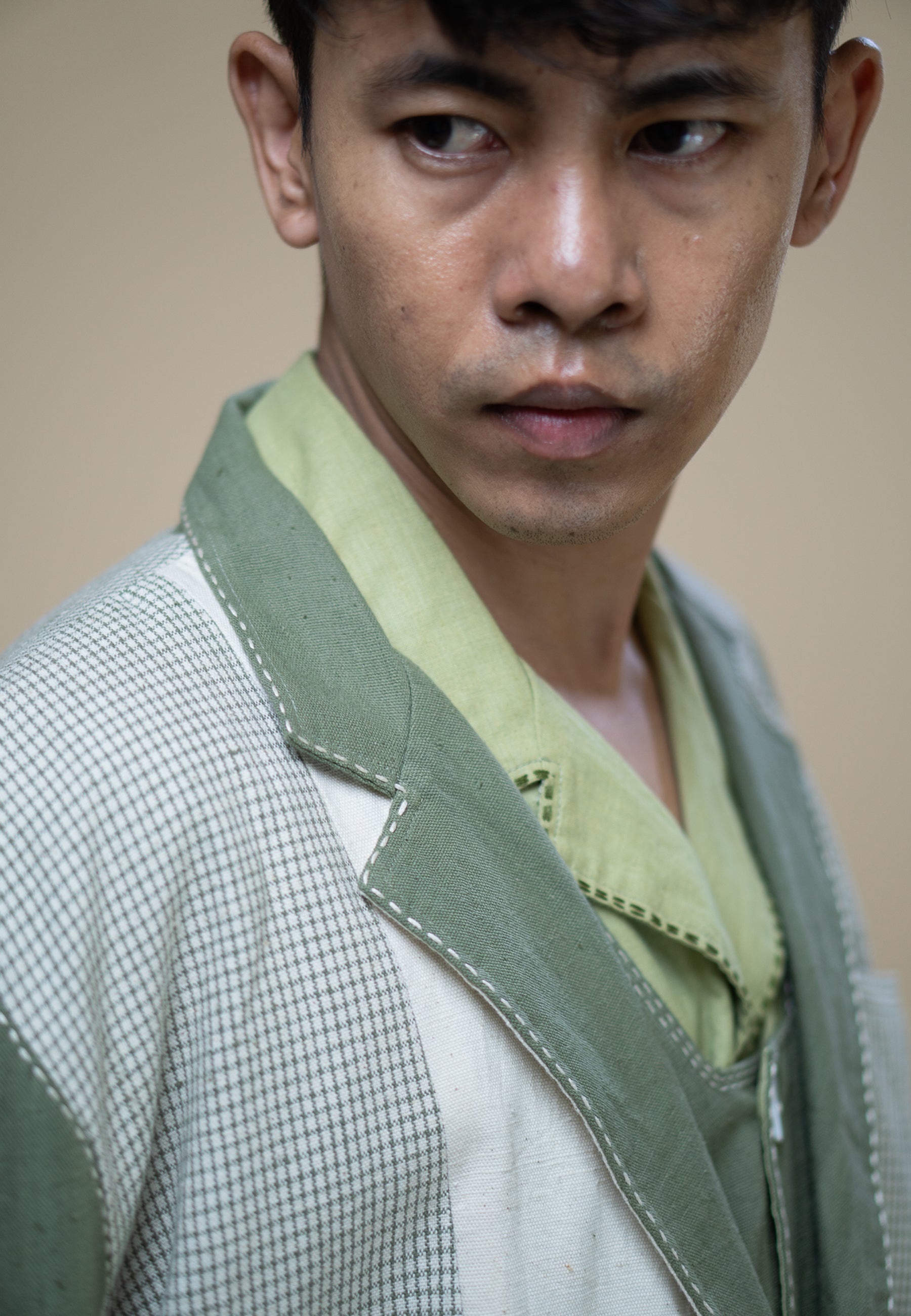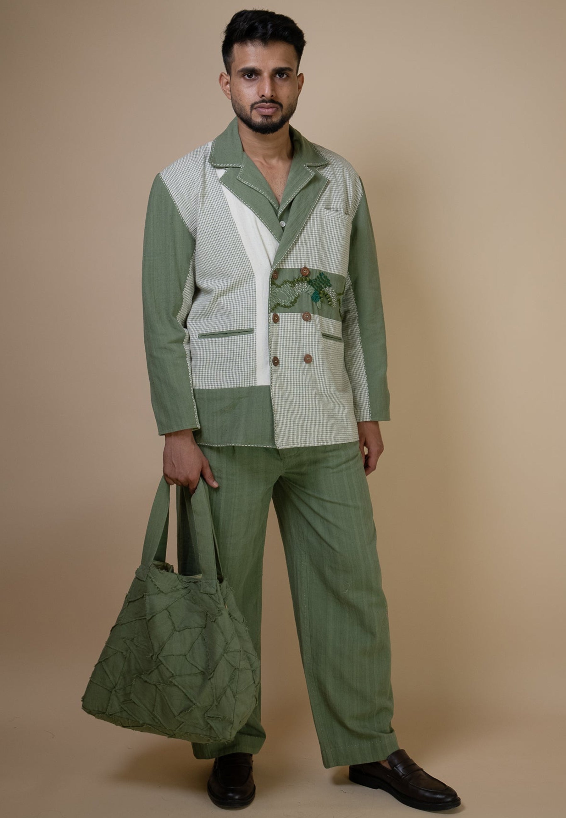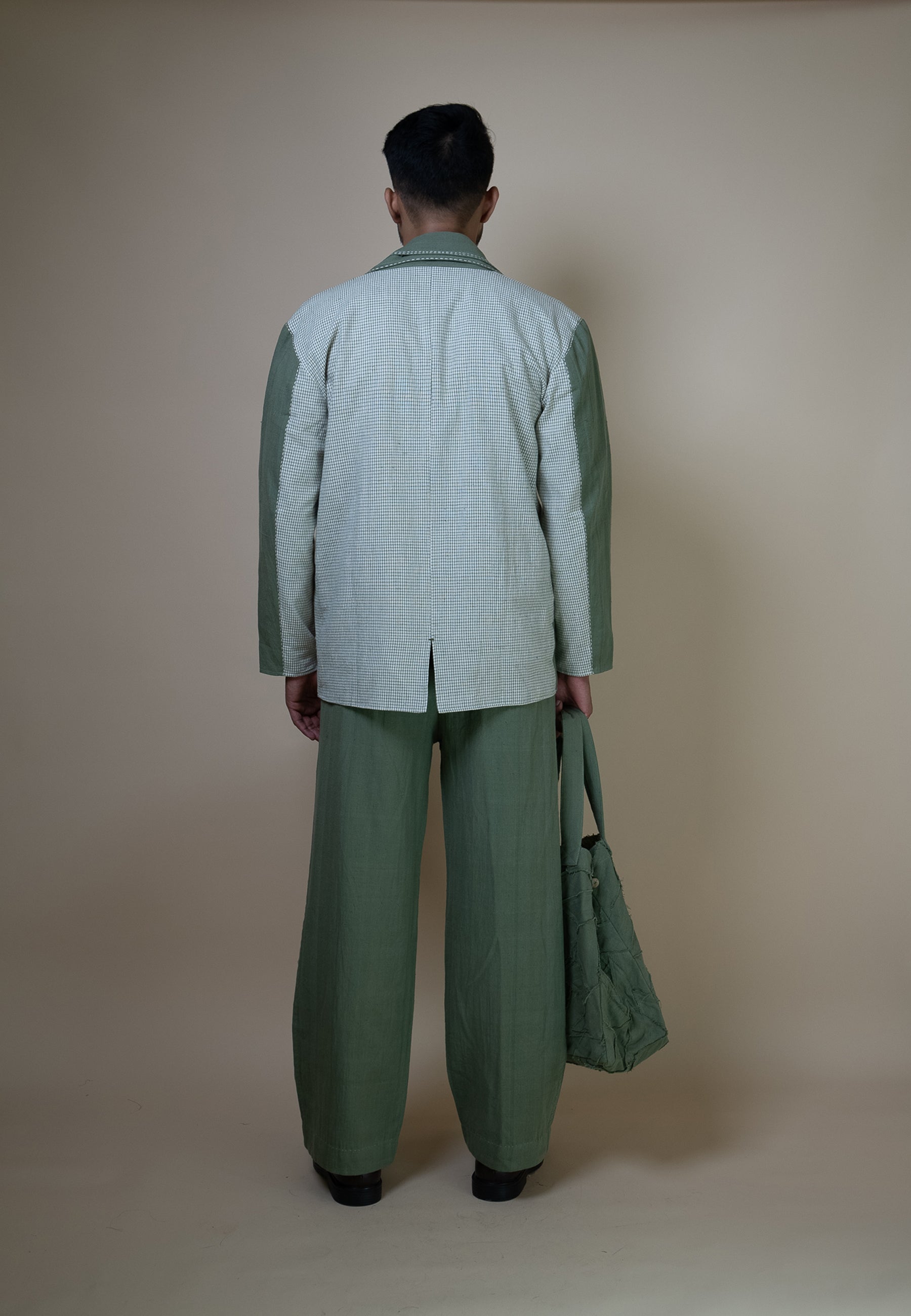 The Meadows Unisex Double Breasted Blazer is crafted from a blend of three variations of our signature Kala Cotton- Undyed, Checkered and Solid Olive in colour using Azo-free dyes. Made from 100% cotton fibers, this blazer transitions seamlessly through the seasons, making it a versatile addition to any minimalist wardrobe with its refreshing yet cozy tone.