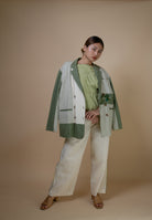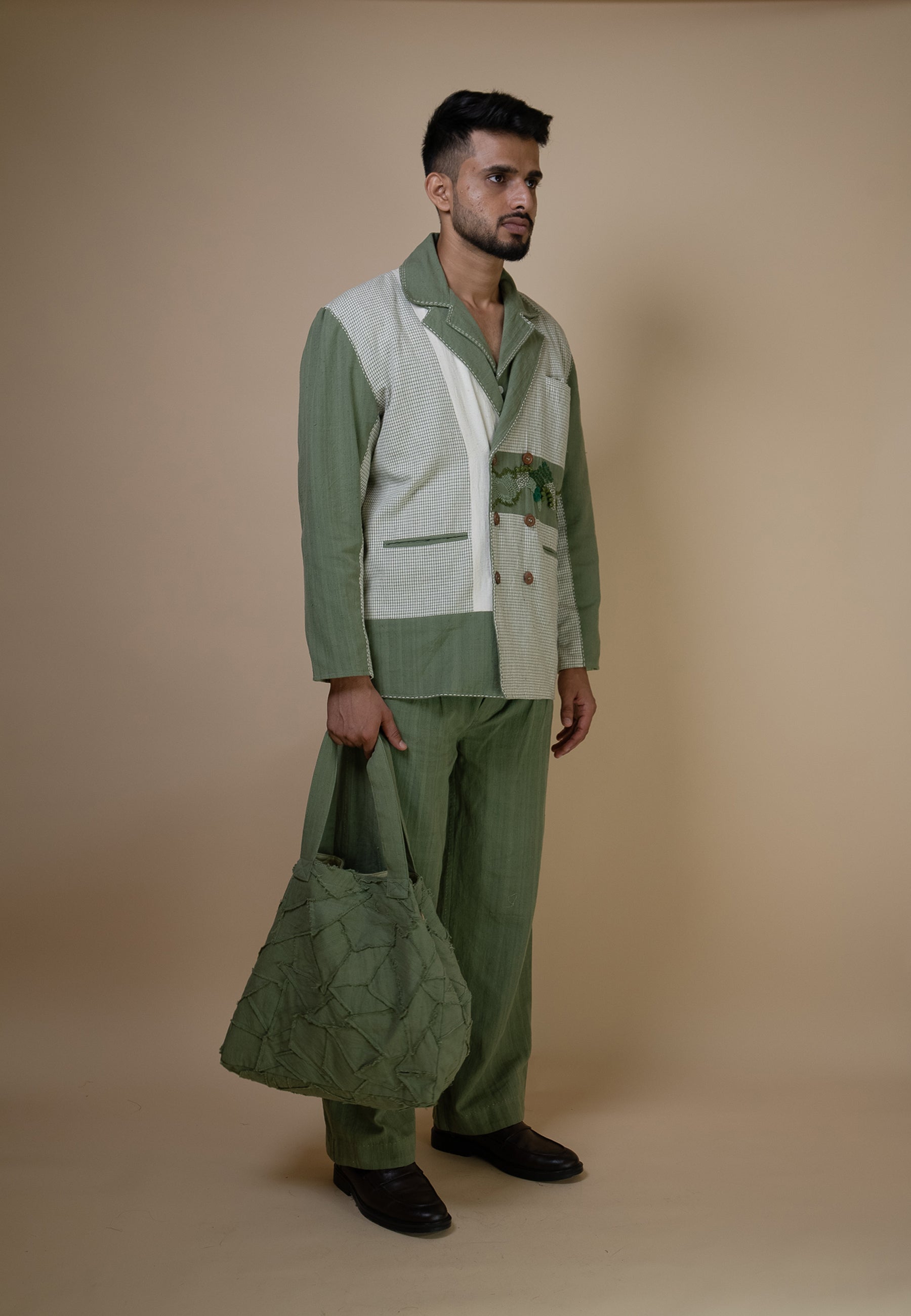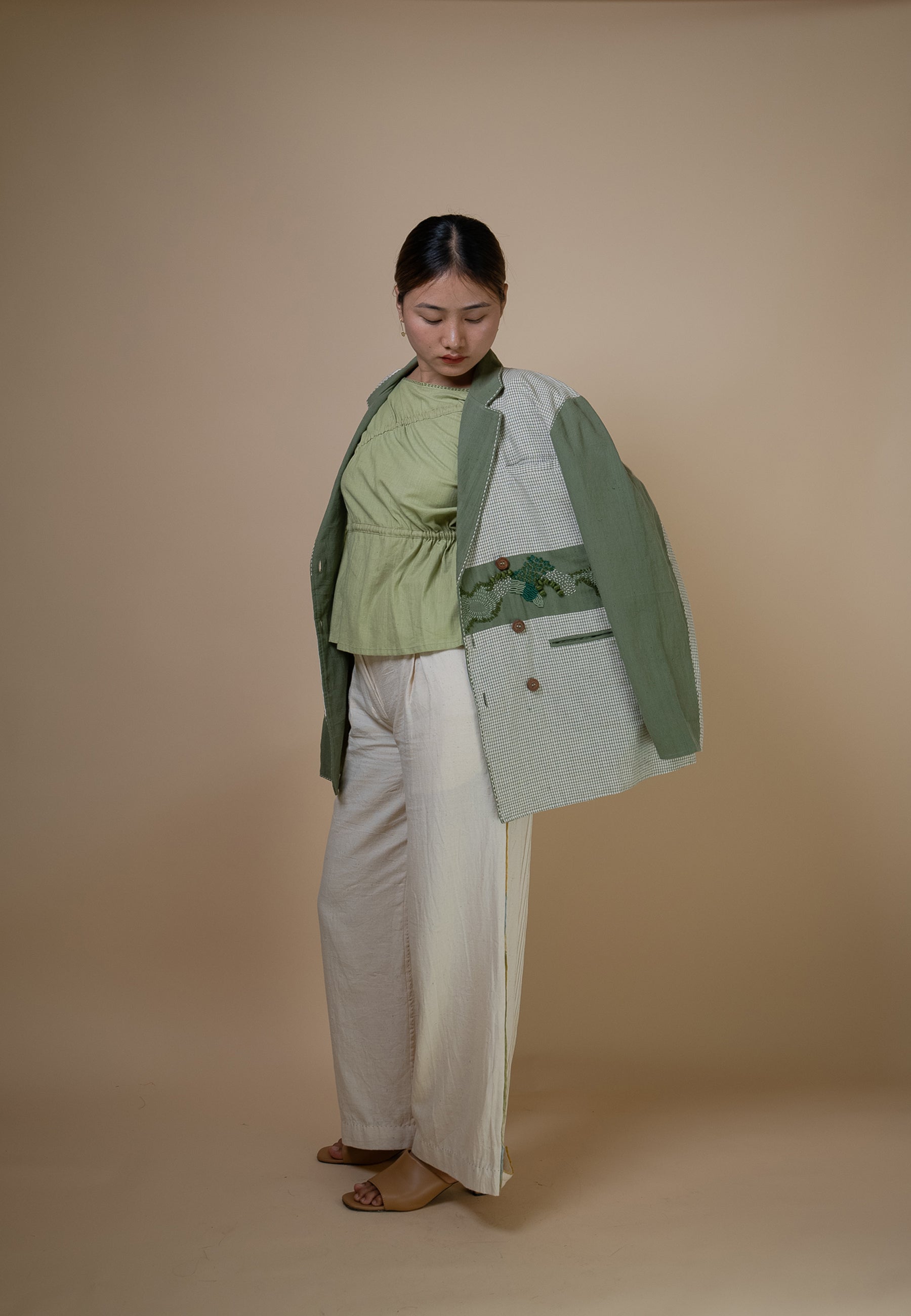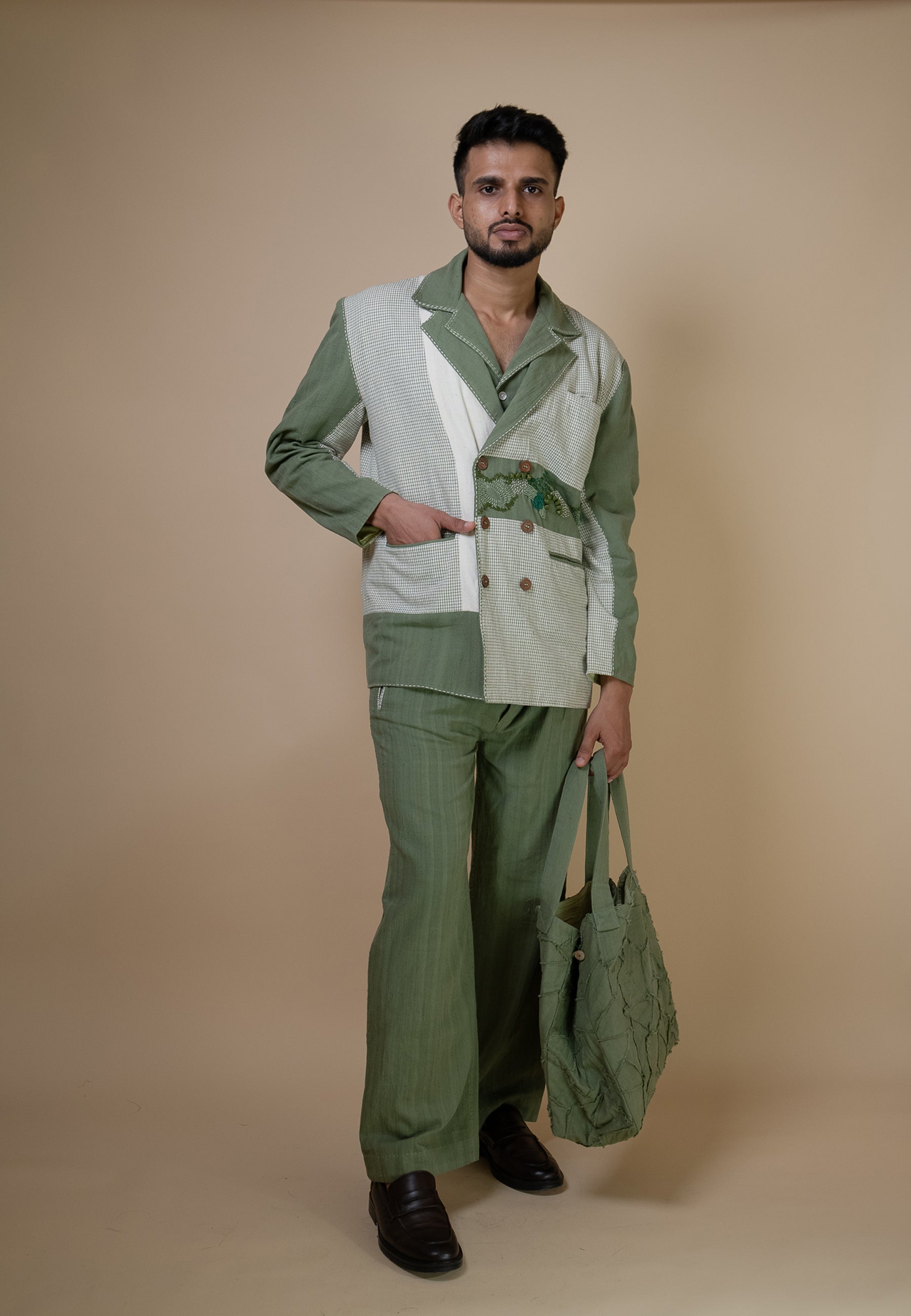 The Meadows Unisex Double Breasted Blazer is crafted from a blend of three variations of our signature Kala Cotton- Undyed, Checkered and Solid Olive in colour using Azo-free dyes. Made from 100% cotton fibers, this blazer transitions seamlessly through the seasons, making it a versatile addition to any minimalist wardrobe with its refreshing yet cozy tone.