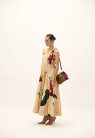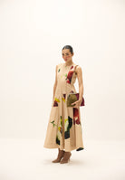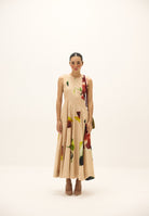 A flowing sleeveless Melba dress crafted in soft printed poplin, featuring delicate pintucks that run seamlessly from top to bottom, creating a lengthening silhouette. The dress is adorned with bold painterly floral motifs in vivid hues, adding a touch of artistic elegance against its neutral base.