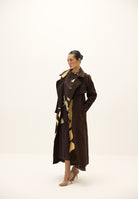 A statement trench in rich corduroy, designed with oversized abstract botanical motifs in muted ochre against deep sepia brown. The longline silhouette features a wide lapel collar, storm flap detailing, and side pockets for functionality. With its structured yet fluid drape, the coat layers beautifully over dresses or separates, offering both warmth and effortless style.
