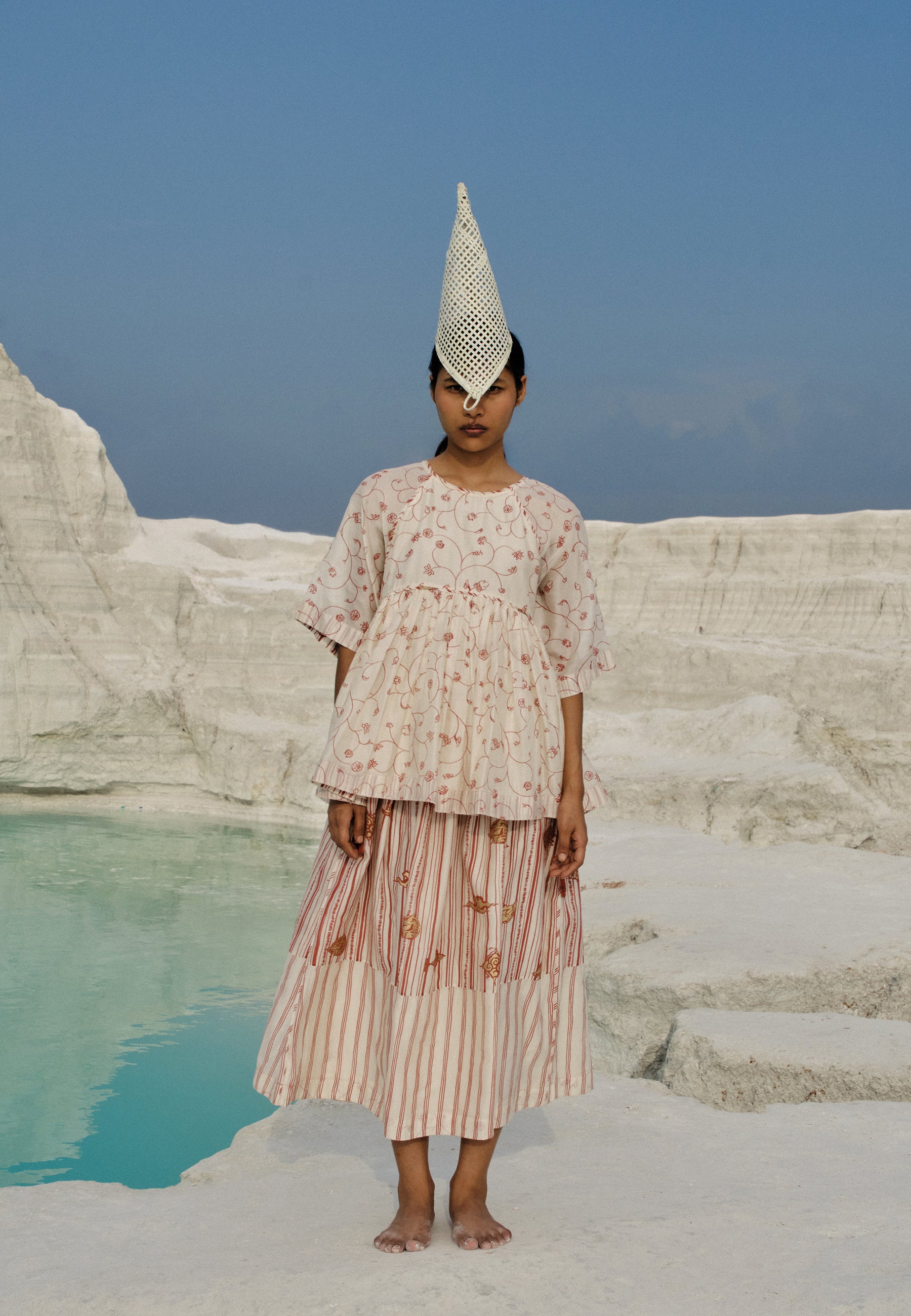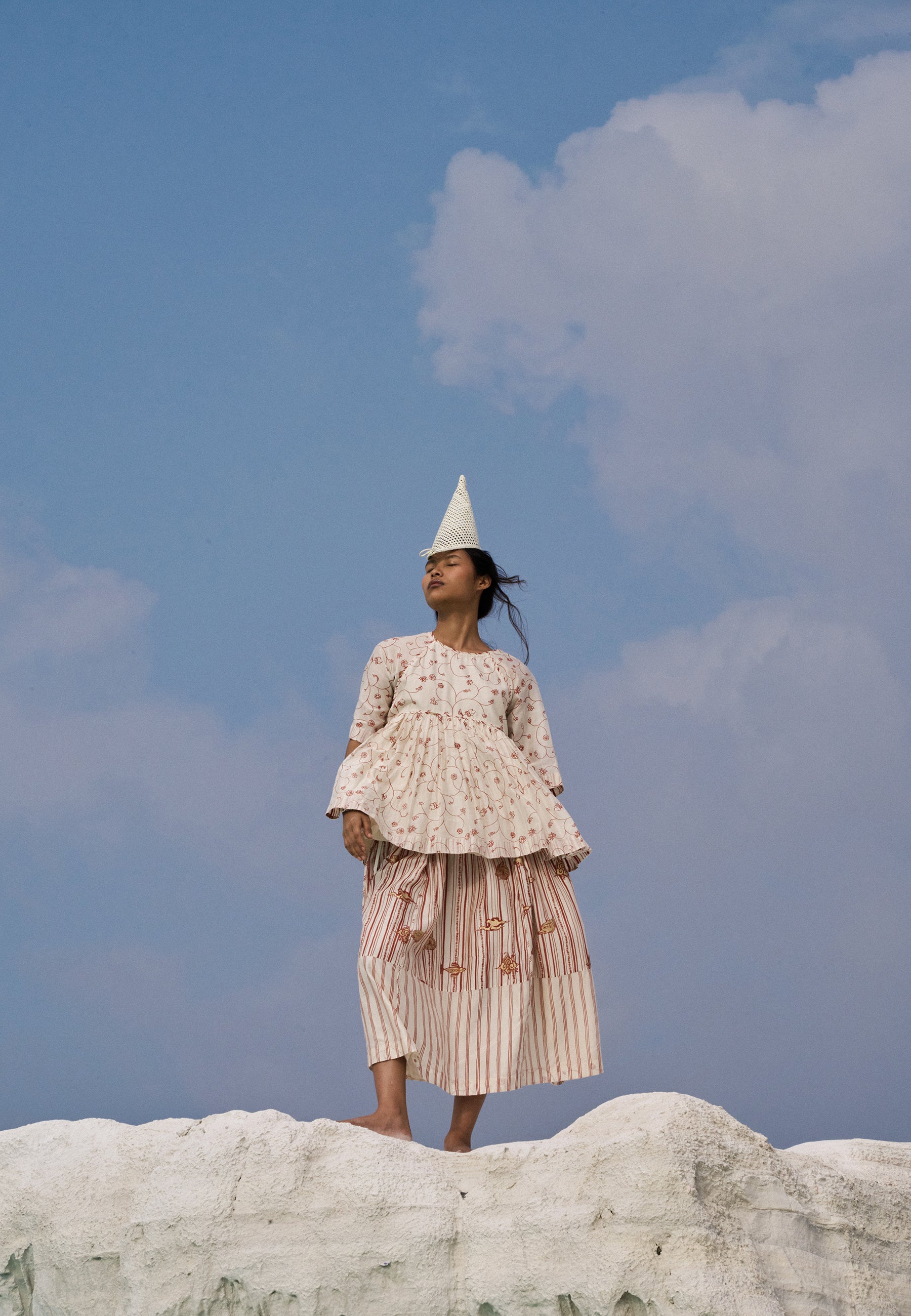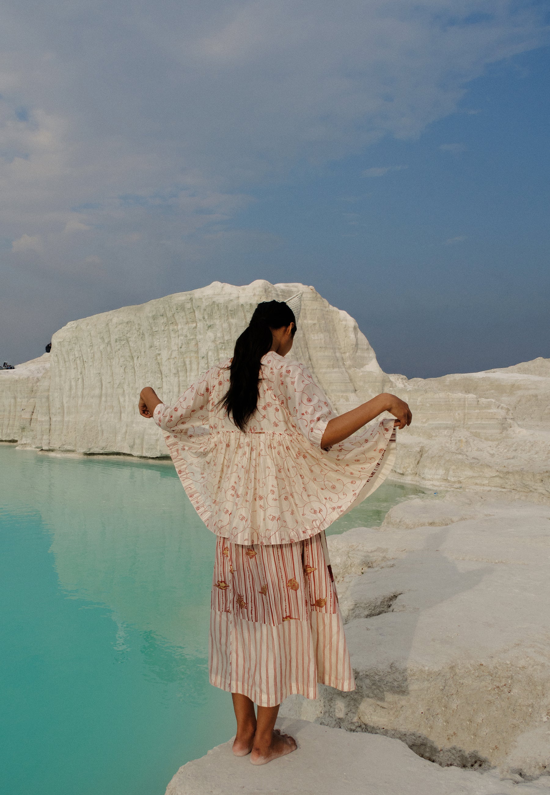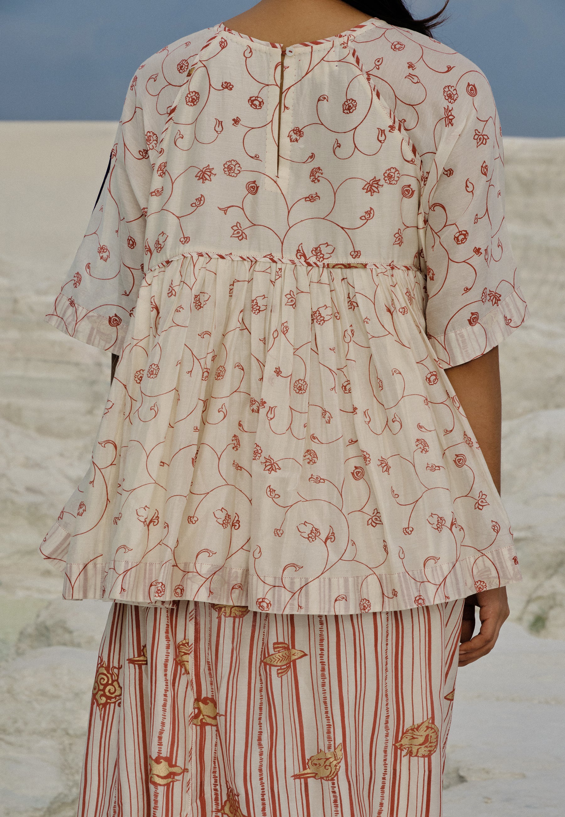 Made in floral hand-screen-printed cotton silk, the Taya Raglan Top drapes gently along the style lines, with soft gathers that create a flowing, airy rhythm. Raglan sleeves lend lightness, while a subtle back opening ensures comfort and ease of movement. Every element—from the delicate binding details at the sleeve to the finished seams—has been carefully executed over hours of skilled labour, making this top a refined celebration of timeless elegance and quiet artistry. It's adorned with mother of pearl buttons.