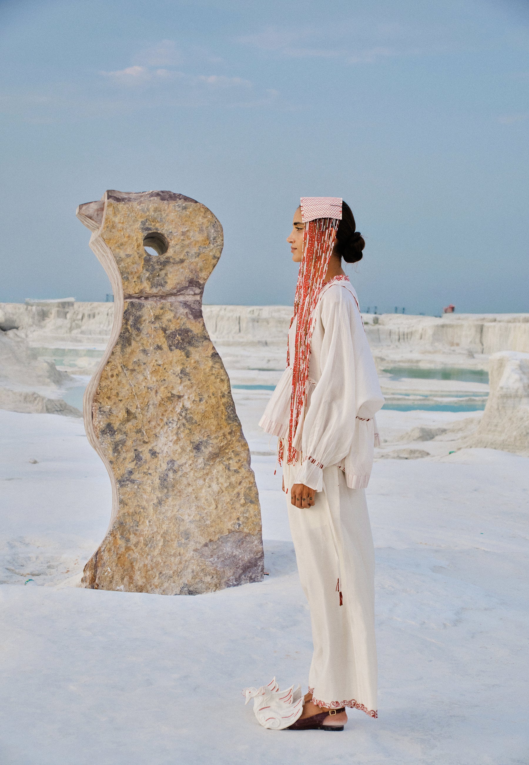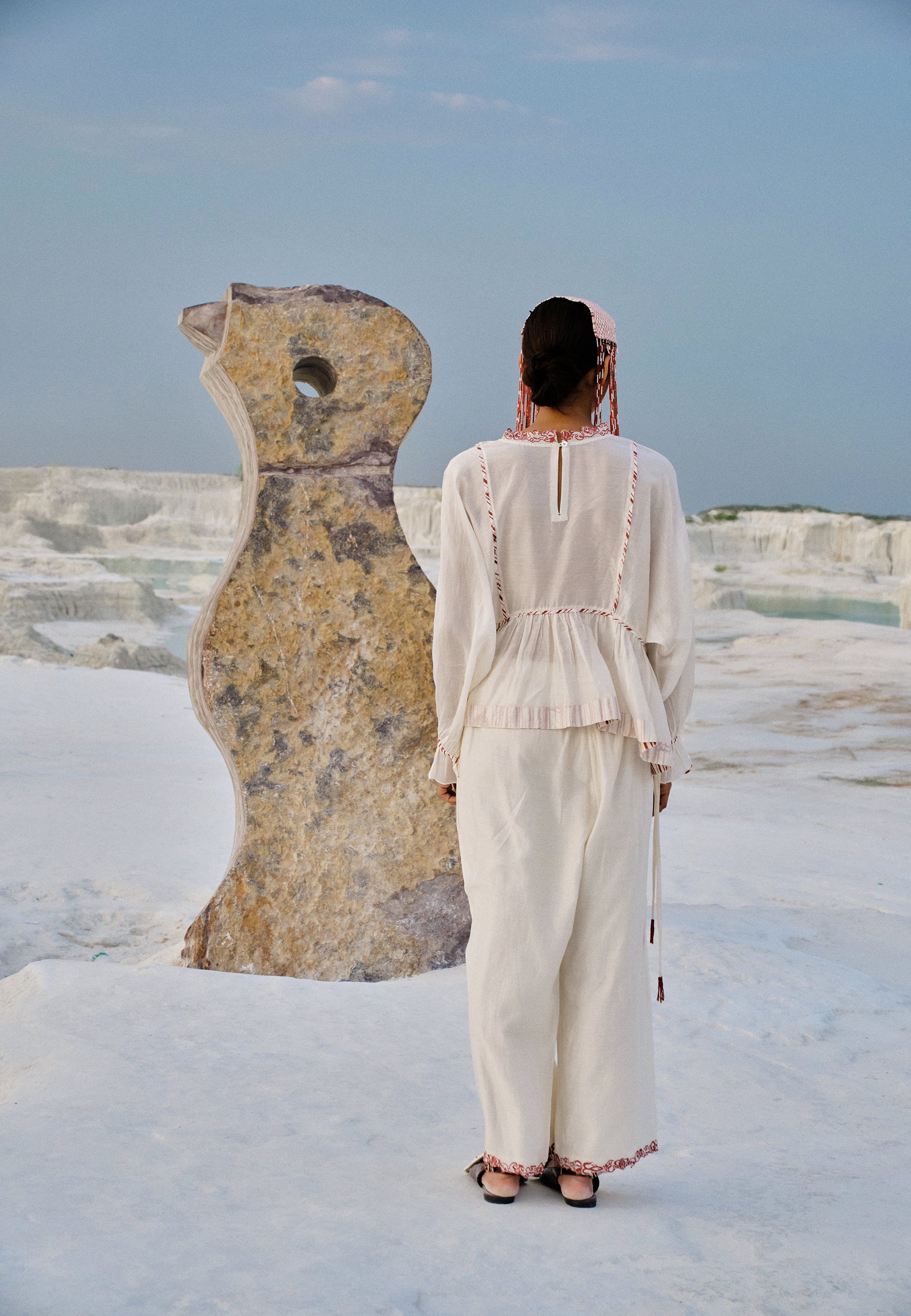 Inspired by the Japanese ideology of wabi-sabi, referring to that which is imperfect, impermanent, aged, humble and authentic, Ahmev carries an aesthetic that embraces the value of the passing of time, the seasoning of time and the elements, the handmade and the simple. Wabi-sabi is a way of being open to emotions and of acceptance; a state of mind and a state of feeling. The philosophy of wabi sabi is embodied in the design process, being showcased in the finished designs through the subtle hues, natural materials, frayed edges and the visible stitching and asymmetry.
