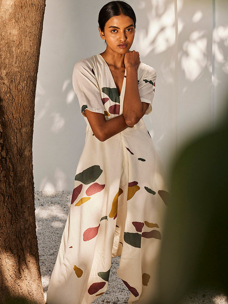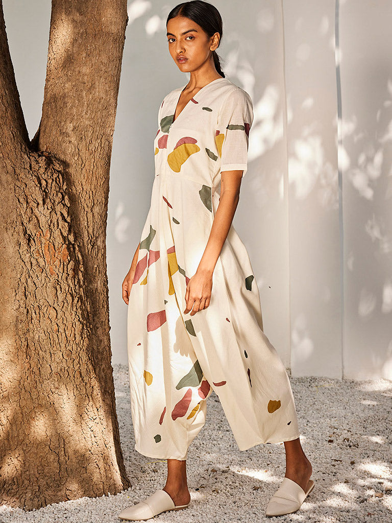 Crafted in soft mulmul cotton, this ecru terracotta print jumpsuit comes with a concealed zipper opening, half sleeves amd side seam pockets. It comes with an attached lining.