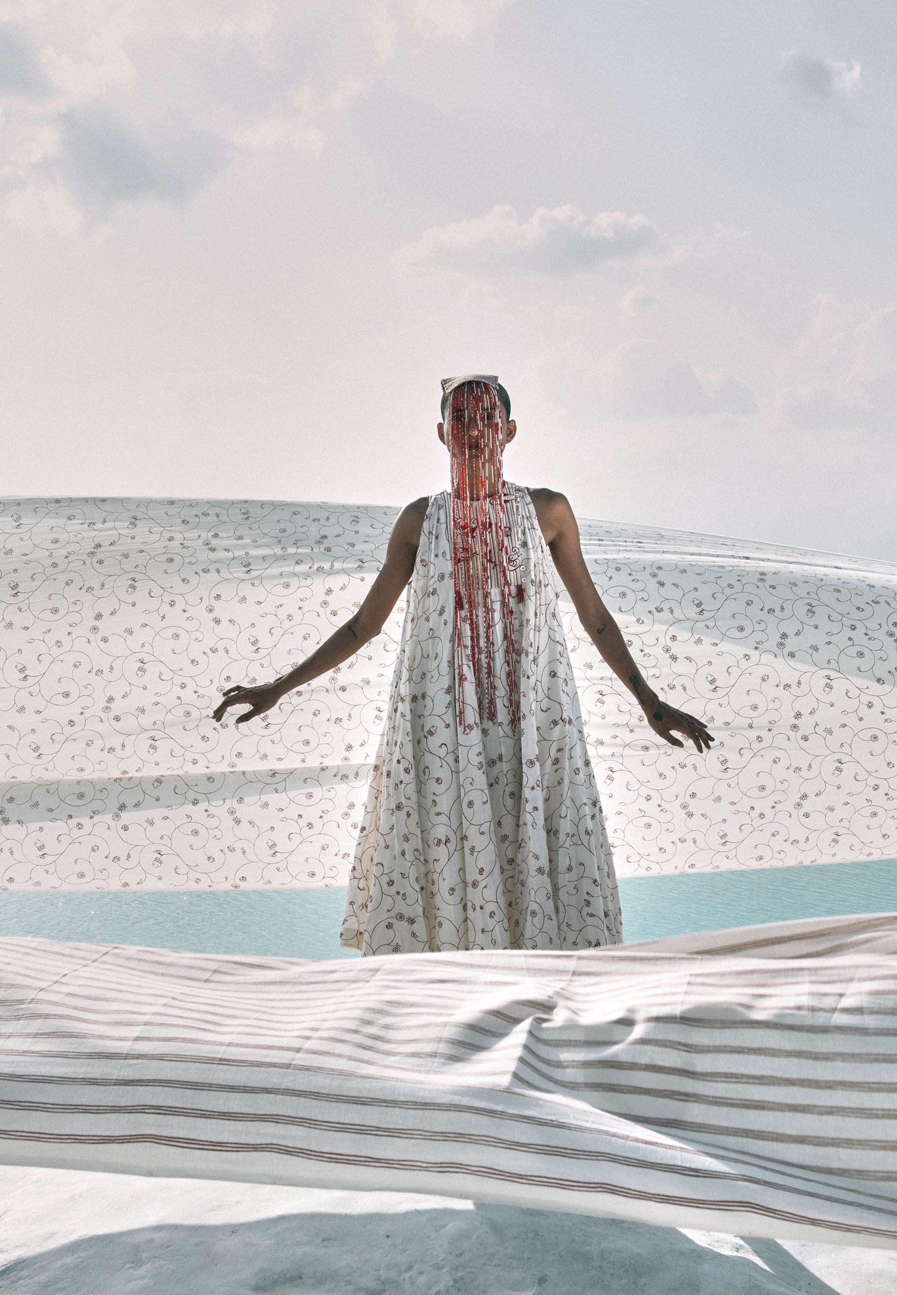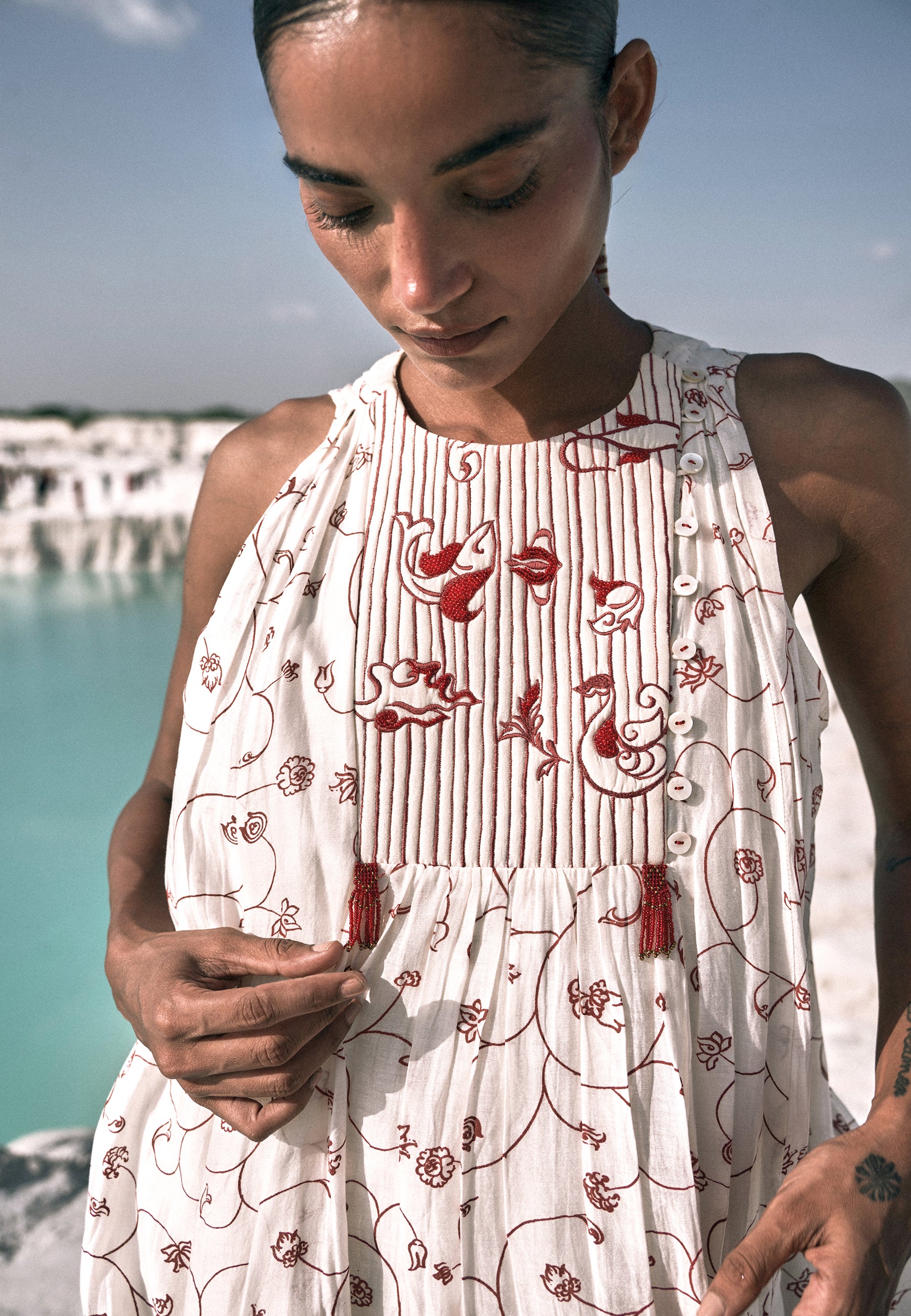 The Yadana Halter Dress, made in hand-screen-printed cotton silk, celebrates thoughtful design and effortless elegance. A quilted yoke with subtle hand-beaded accents anchors the silhouette, while soft godets and gathers allow the fabric to cascade fluidly over the body. Front buttons add subtle detail, and every element has been crafted with hours of careful labour. This versatile dress combines artistry, comfort, and timeless sophistication, perfect for understated occasions.